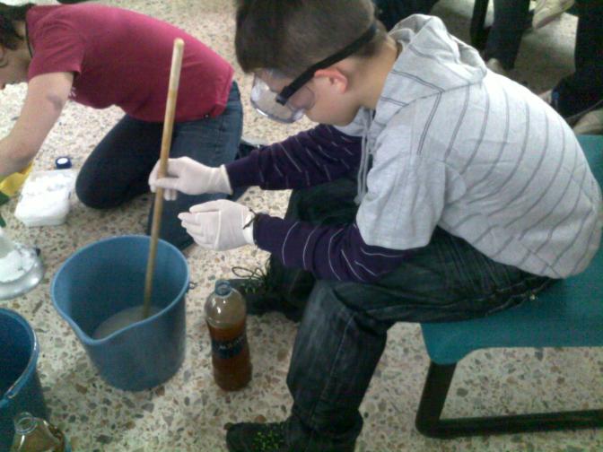 Te recomiendo que en Internet busques la receta exacta… Se mezcla con sosa y se bate, con mucho cuidado, durante bastante tiempo, dejándolo despues en un molde, para luego endurecerlo y cortar en pastillas.