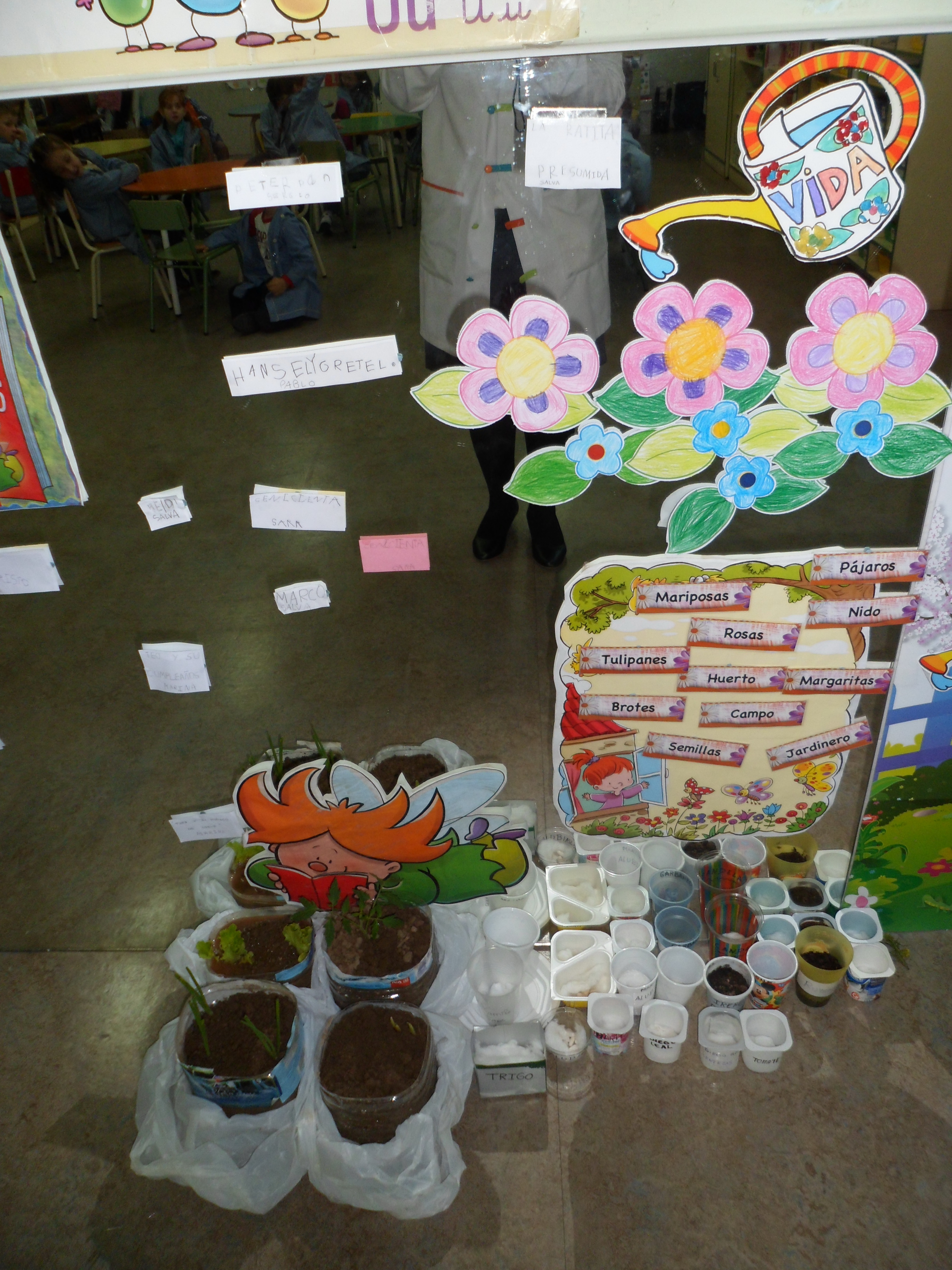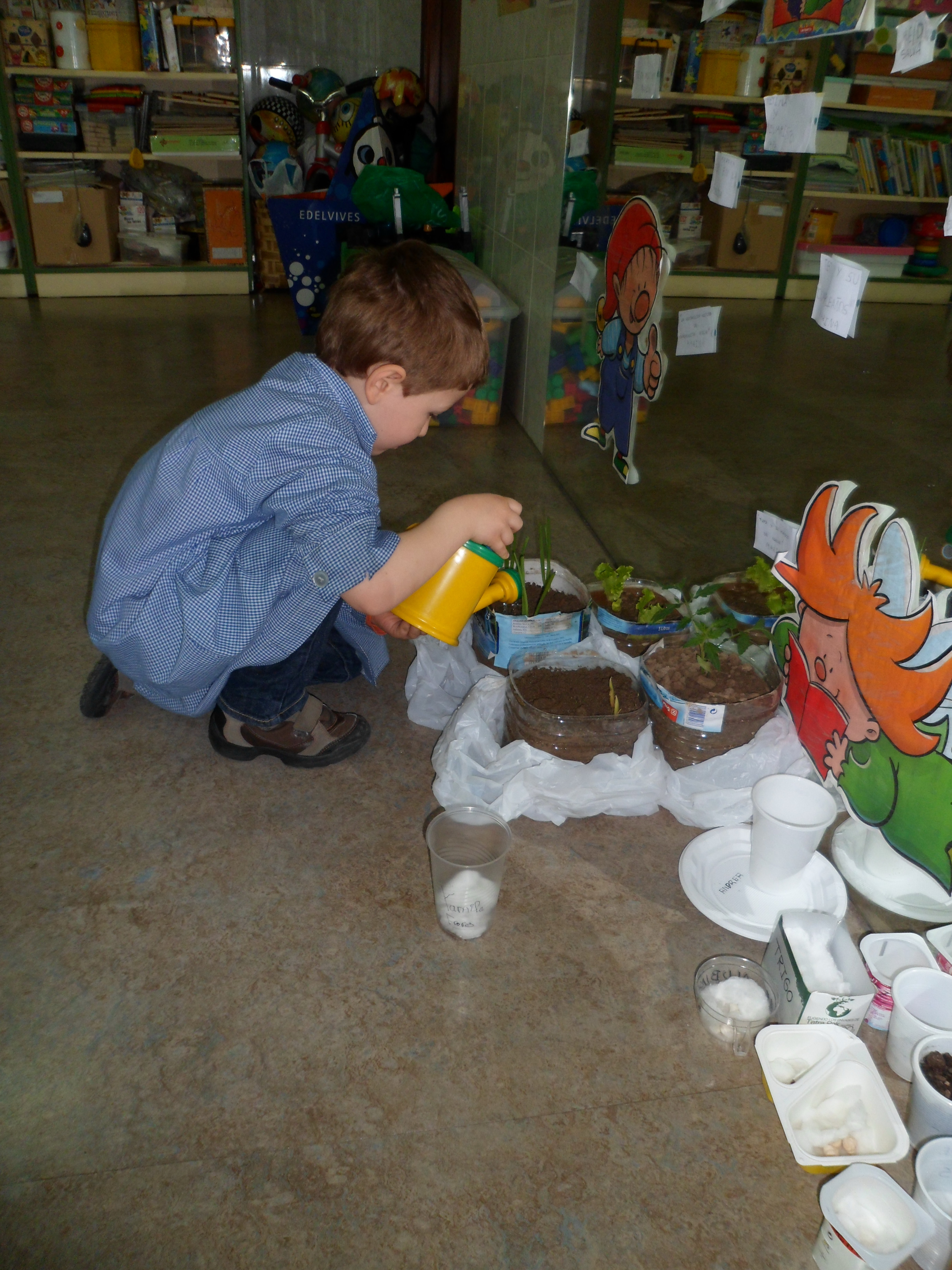 Los niños traen semillas para plantarlas en clase, cuidarlas y ver cómo con cariño van creciendo plantas diferentes, viendo sus raíces, sus tallos y las hojas de las mismas. De esta forma los niños pueden comprobar la gran variedad de semillas y plantas que existen y que para su germinación necesitan intercambiar materiales con el medio: agua, luz, etc.