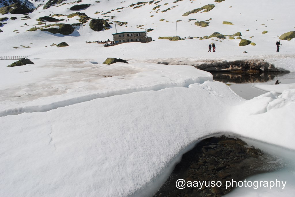 Después de un pequeño piscolabis, iniciaremos un descenso hasta la propia Laguna, en cuyas inmediaciones se ubica el refugio Elola. El descenso es bastante pronunciado y la nieve lo hace bastante peligroso. En esta zona hay que tener especial cuidado de no resbalarnos.