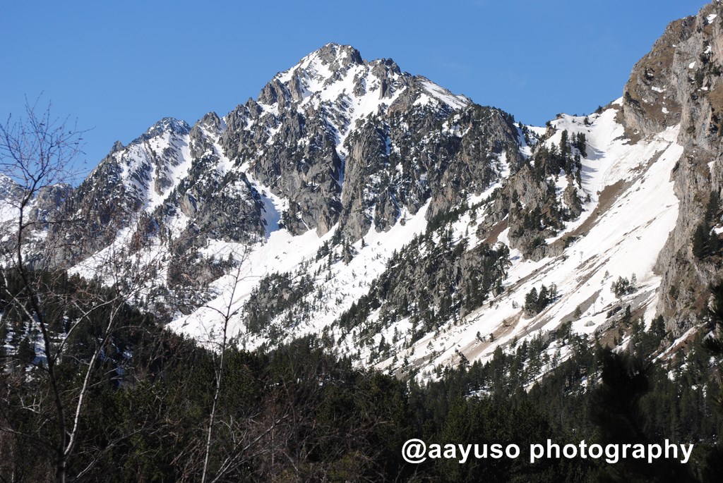 Es un camino de continua ascensión sin demasiada dureza entre frondosos bosques de pino negro, abeto, pino silvestre, abedul y haya que constituyen el hogar de multitud de interesantes plantas y fascinantes animales de origen alpino o boreal. Por supuesto no vimos ninguno. Según subimos por la pendiente, a través de pequeños neveros, podemos observar la majestuosidad del Pico “Els Encantans”. Dicen que “si vienes a Pirineos y no ves este pico, realmente no has estado en Pirineos”.