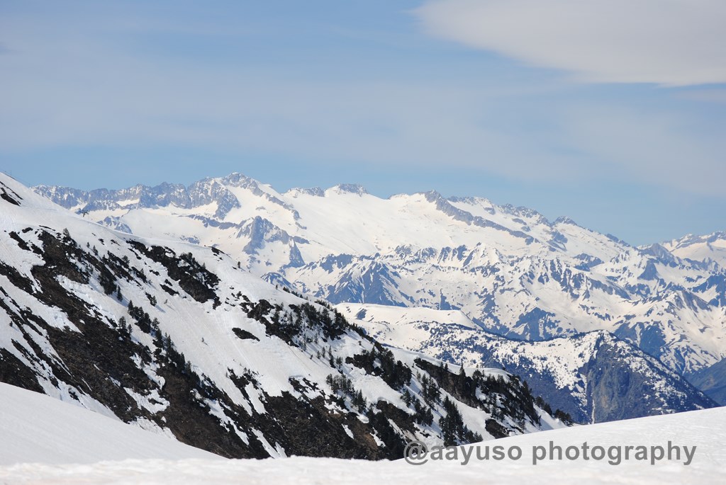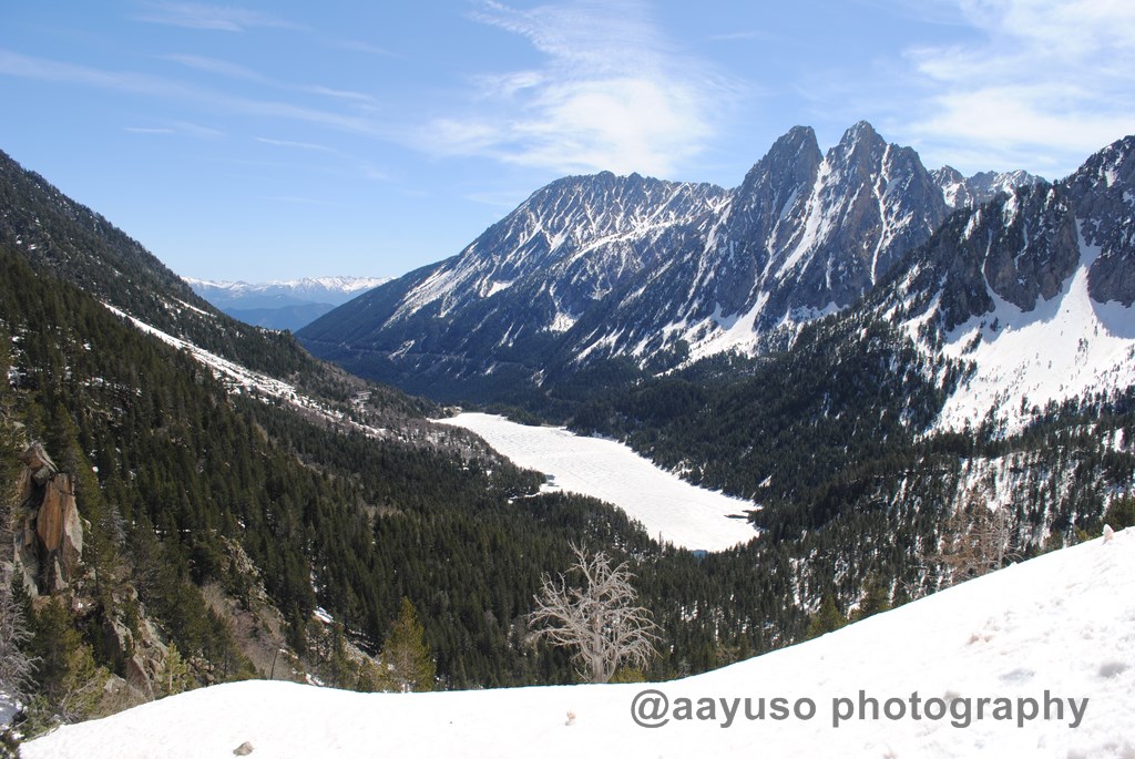 Estos lagos, que en esta época se encuentran también completamente helados, hacen una forma de “ocho”, ya que donde termina uno, empieza el otro. Allí pudimos contemplar los inmensos picos que circundan los lagos, y paramos a comer. La comida la hicimos con unas de las mejores vistas que se pueden tener en Pirineos, el macizo central, con el imponente Pico Aneto.