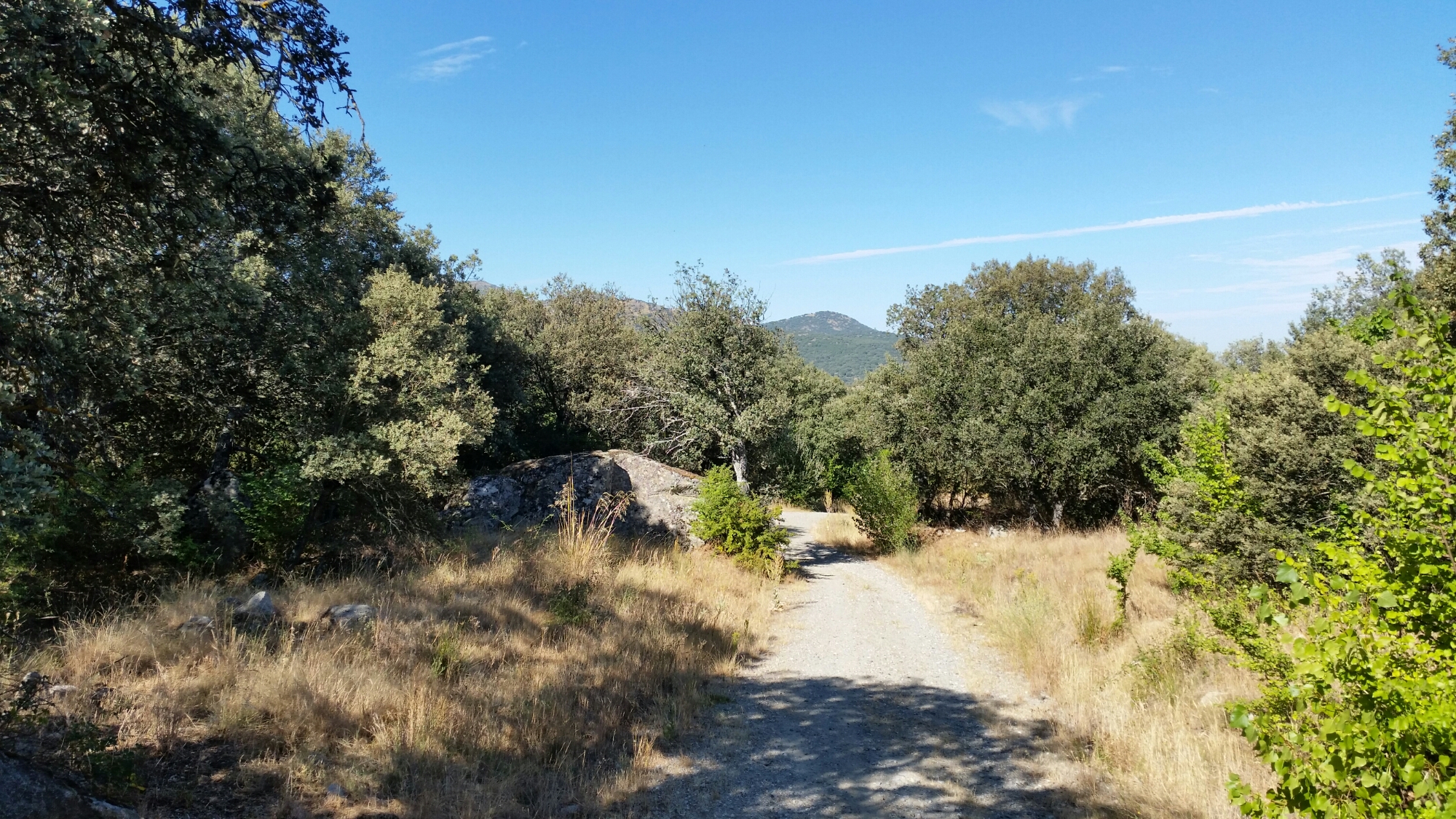 Bajamos por el camino perfectamente marcado rodeados de encinas bajo un sol de justicia. Durante toda la ruta nos acompañará en todo momento el helicóptero de la Junta de Castilla y León que esta haciendo las tareas de extinción del incendio tomando agua del embalse.