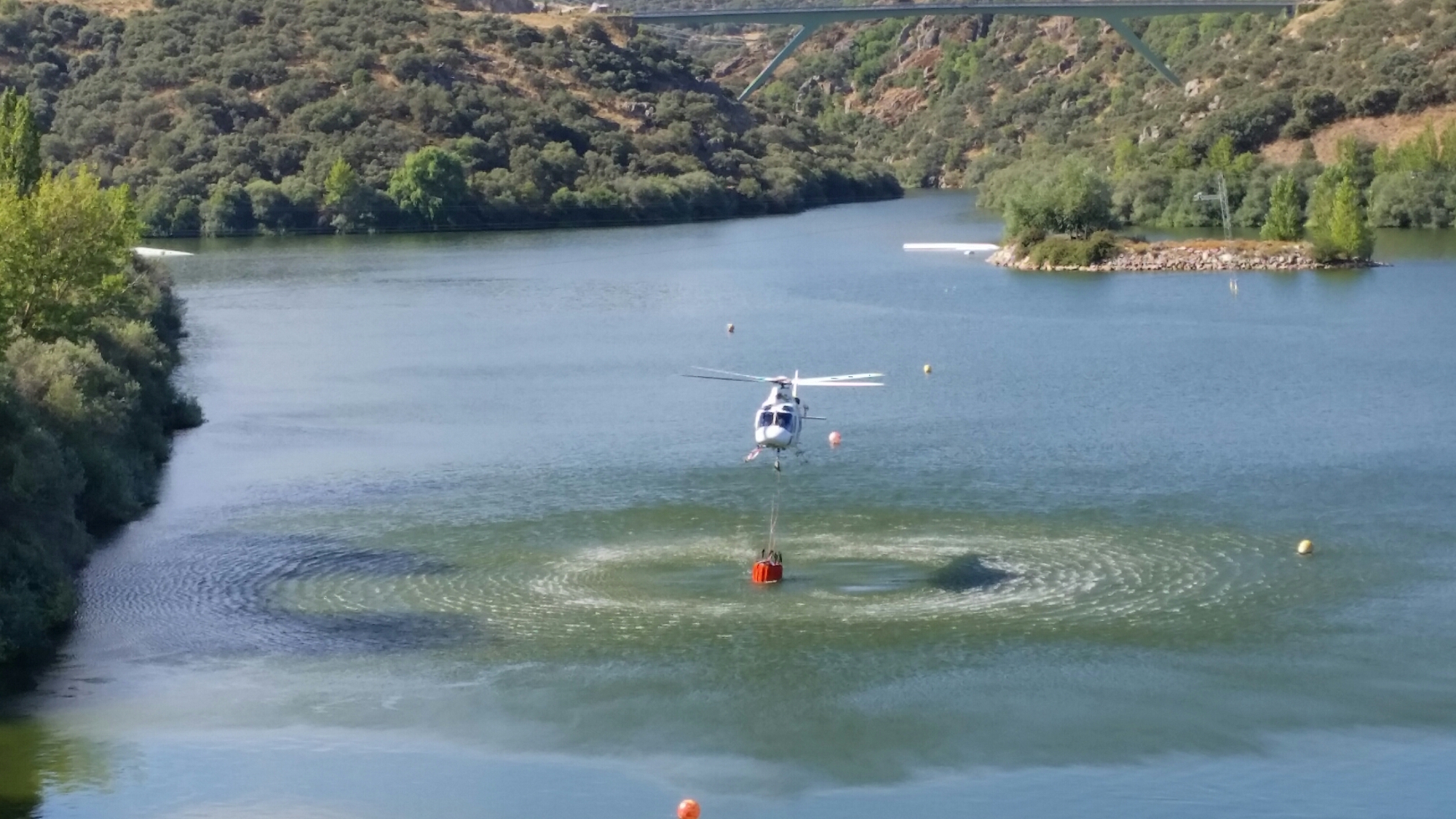 Desde la presa pudimos observar las maniobras del helicóptero para recoger el agua del pantano y llevarla al núcleo del incendio.