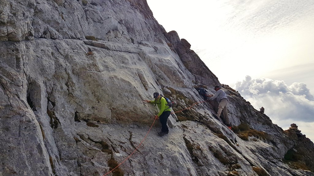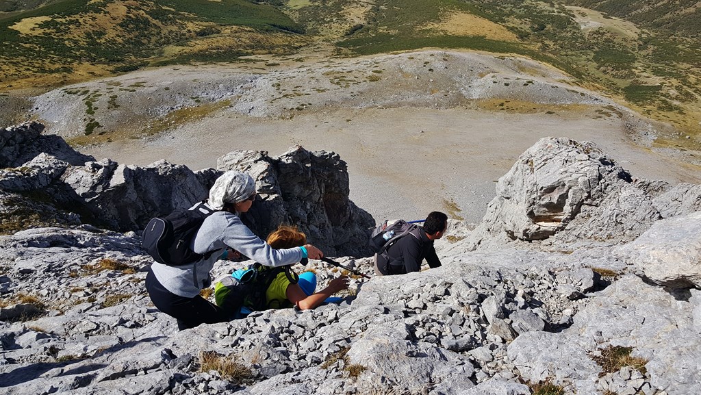 Esta parte es una de las más complicadas y peligrosas del Pico Espigüete que debe hacerse únicamente con profesionales y el material adecuado. Parte del descenso lo realizamos agarrados a la pared. En algunos tramos incluso se hace necesario echar la cuerda para asegurarnos.