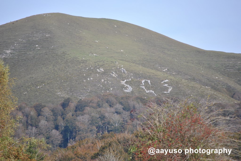 Desde el final del pueblo podemos contemplar el monte Menditxuri que vamos a subir. A lo lejos divisamos un SOS en la ladera del cerro. Los vecinos lo han colocado como símbolo de protesta debido a que el Gobierno de Navarra ha decidido construir varias canteras a lo largo de las lomas. Estas canteras proporcionarán riqueza al Gobierno, pero dejará una profunda huella en el monte.