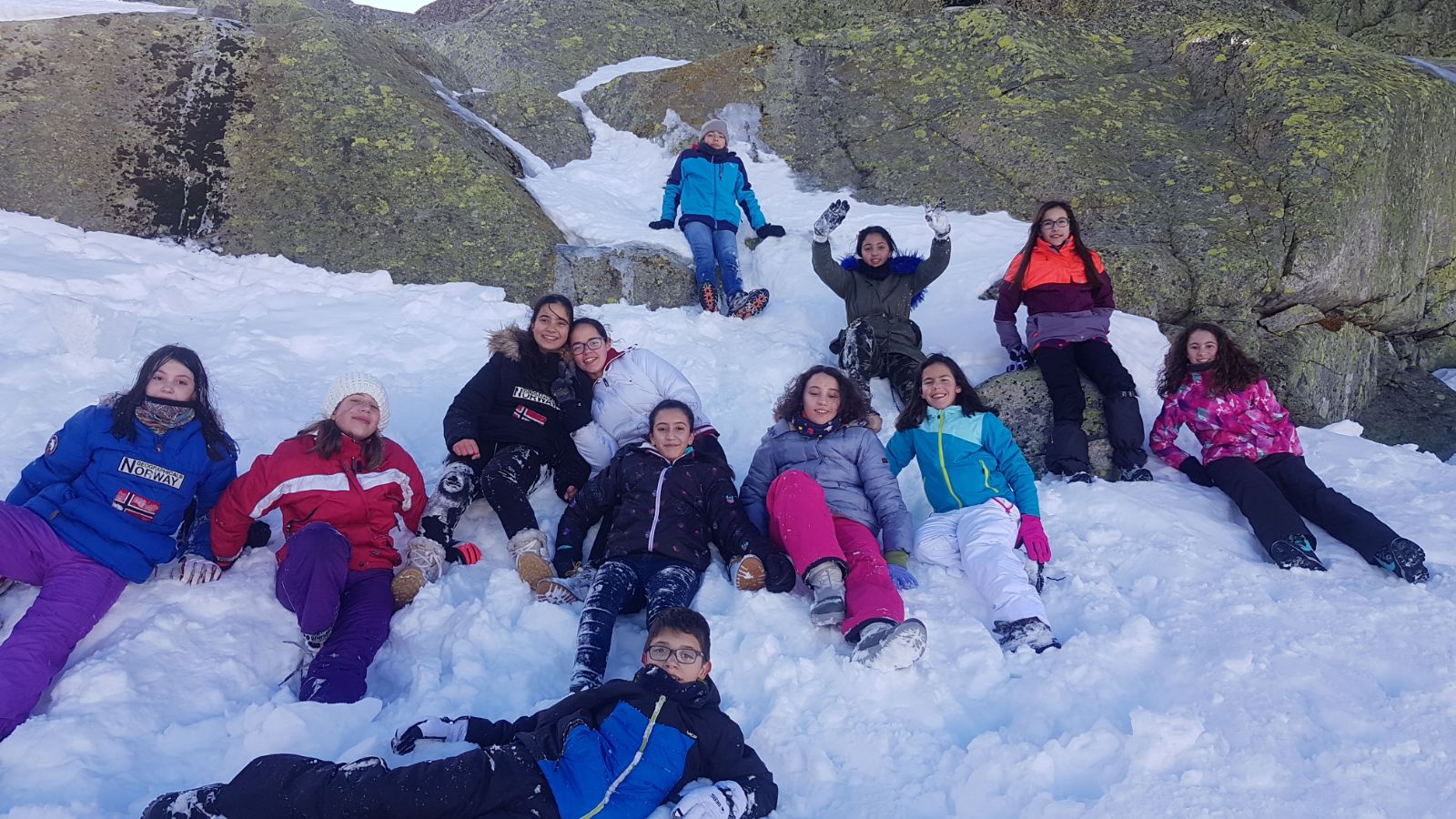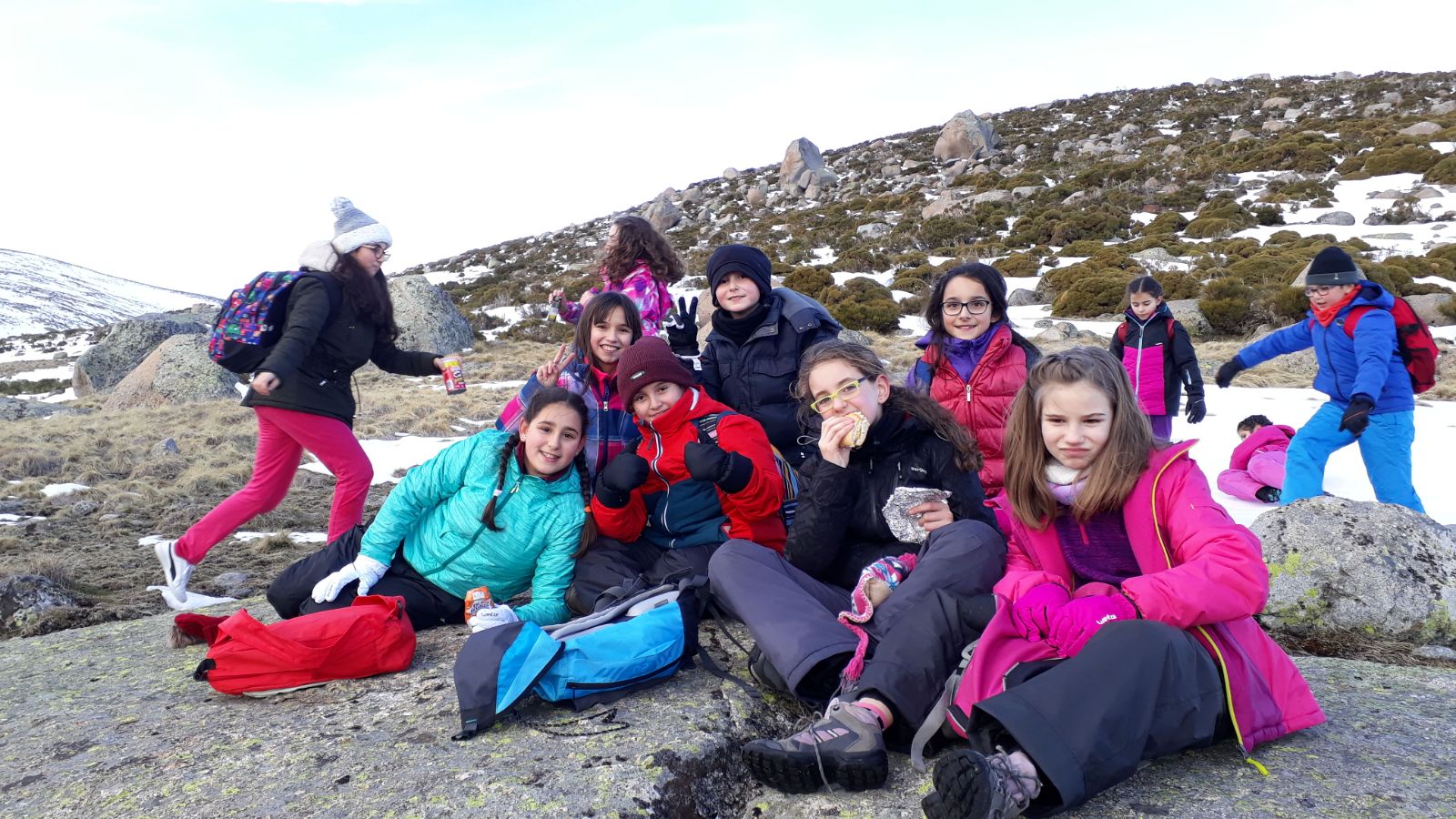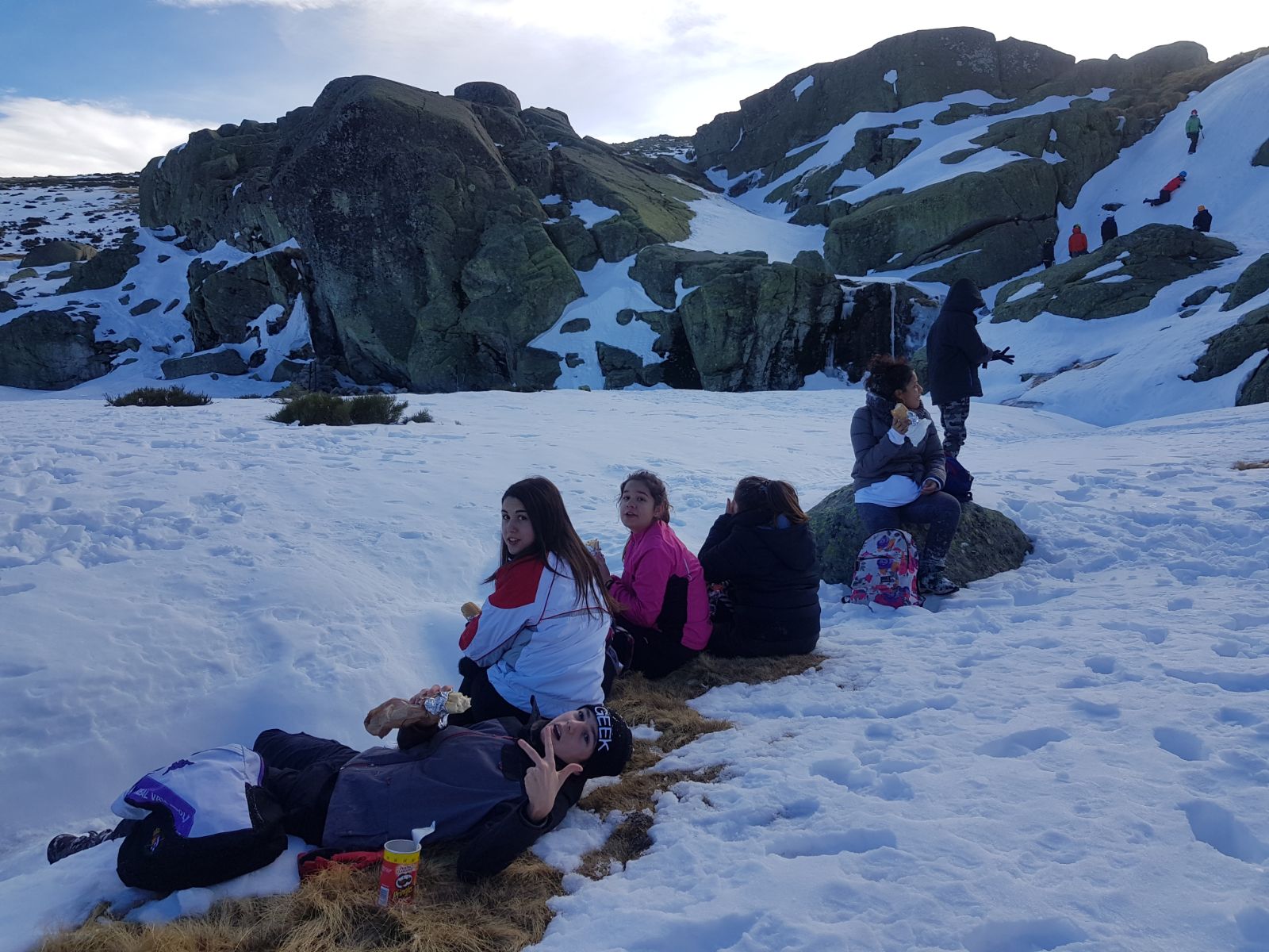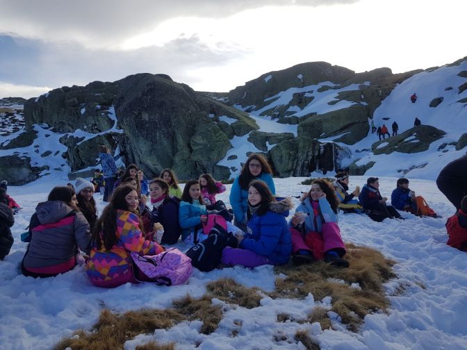 Aquí, disfrutamos del paisaje, comimos el bocadillo y jugamos con los compañeros a tirarnos por las laderas con los plásticos y lanzarnos bolas de nieve.