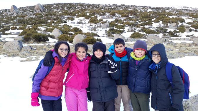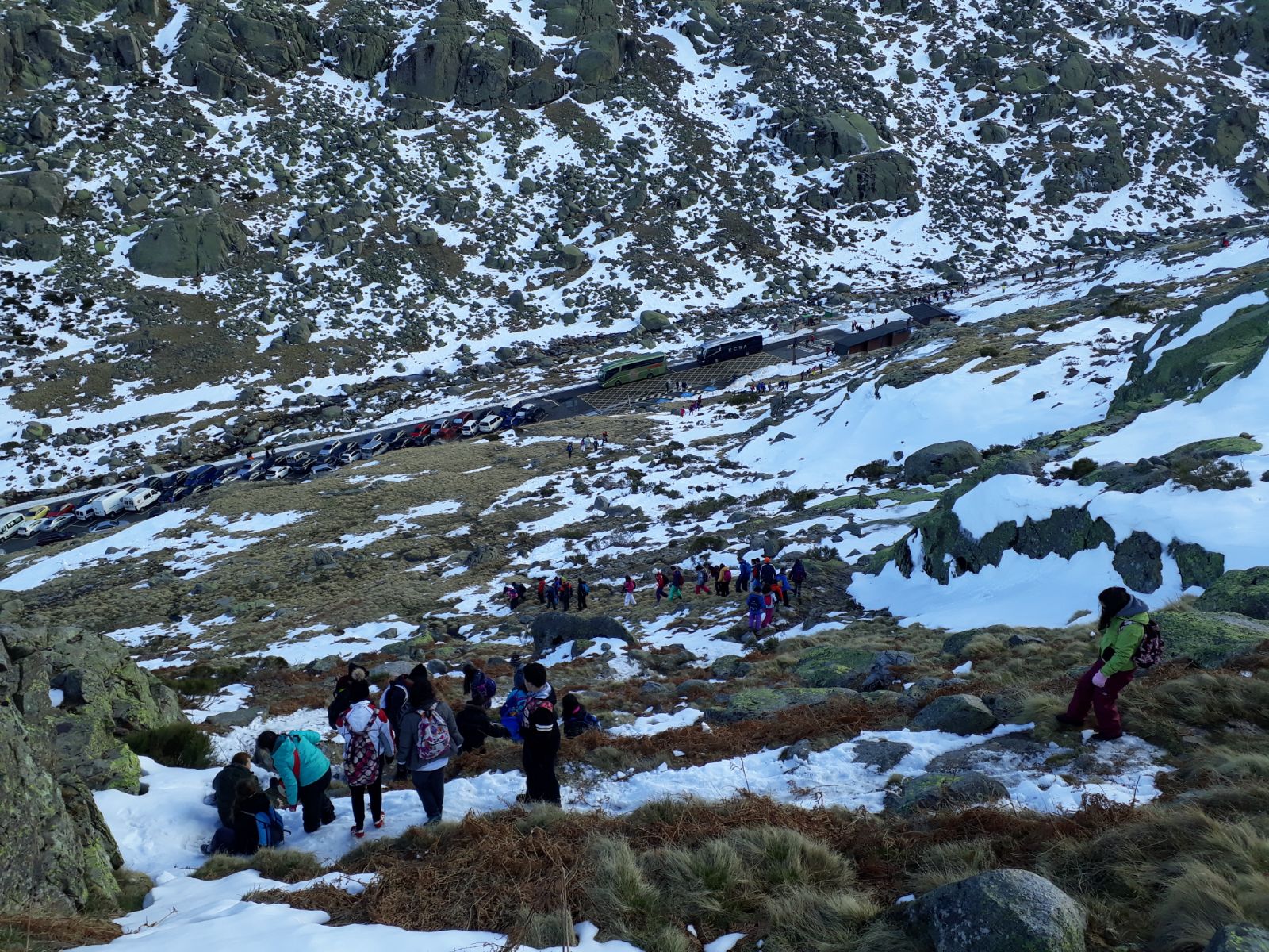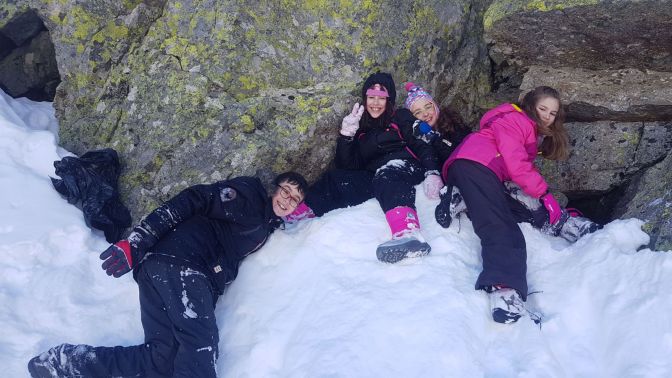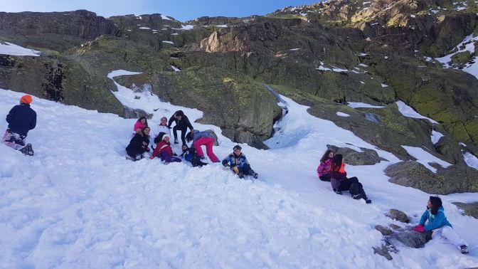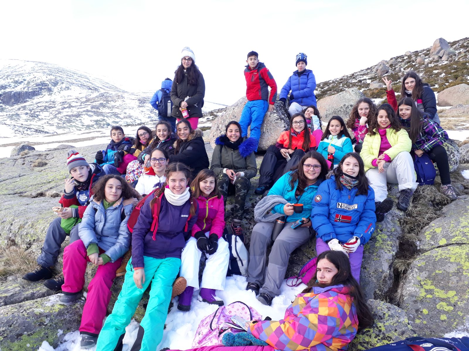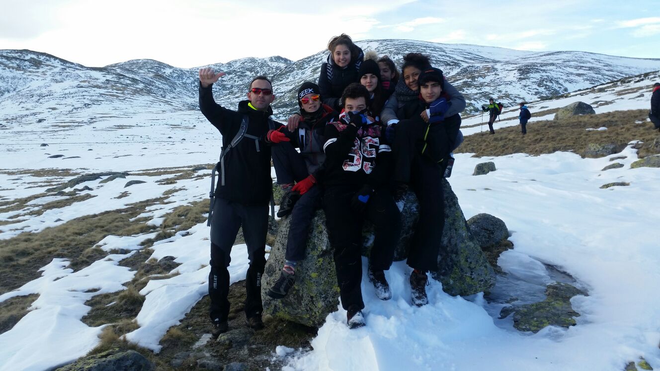 Aquí, disfrutamos del paisaje, comimos el bocadillo y jugamos con los compañeros a tirarnos por las laderas con los plásticos y lanzarnos bolas de nieve.