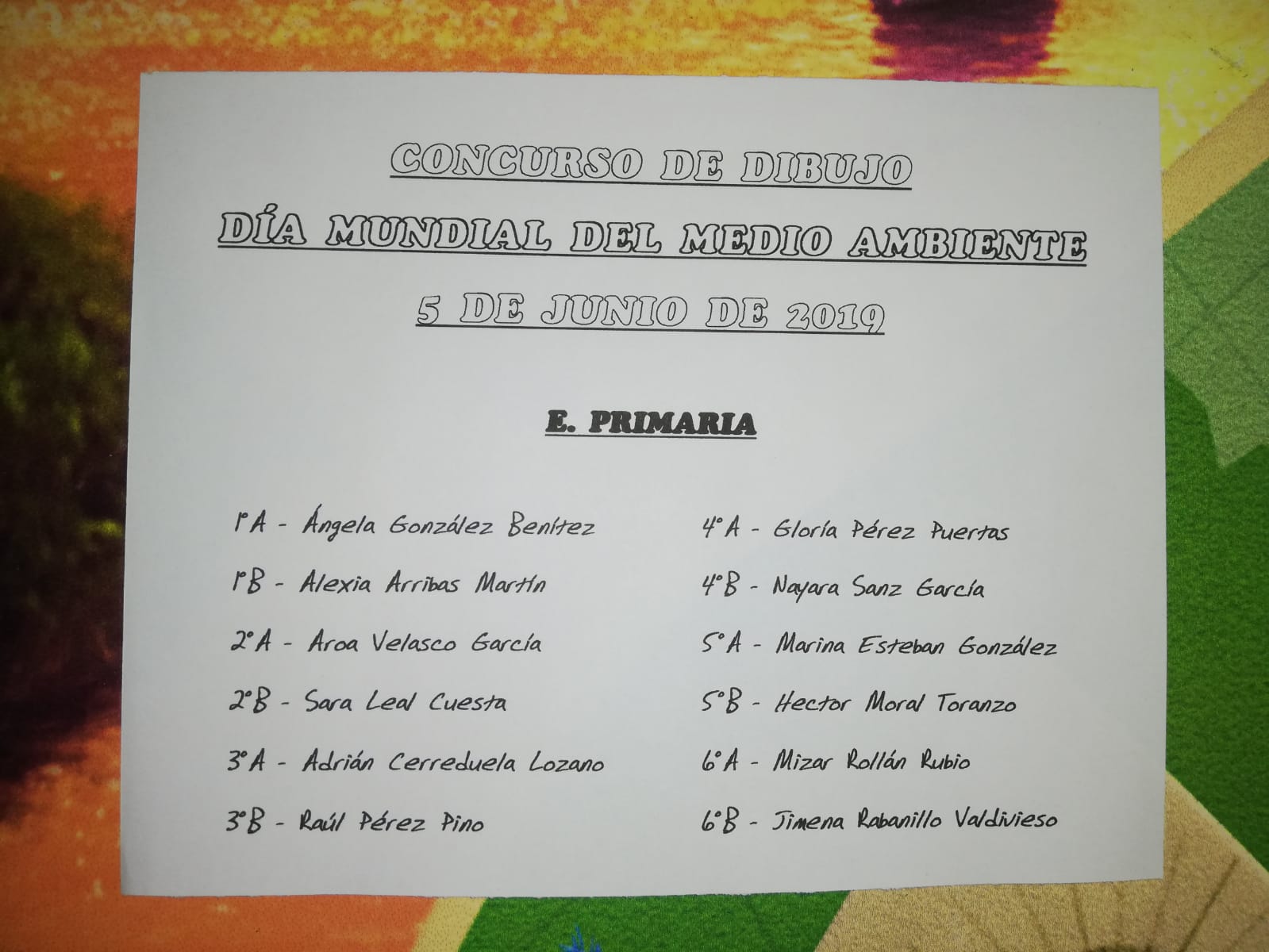 En cada clase, de 1º a 6º de Educación Primaria, cada niño/a ha elaborado un eslogan con temática medioambiental y elegido el que más guste para representar a toda la clase. El eslogan ganador se ha colocado en la puerta de la clase durante toda la semana para que el resto de grupos lo pudieran ver.