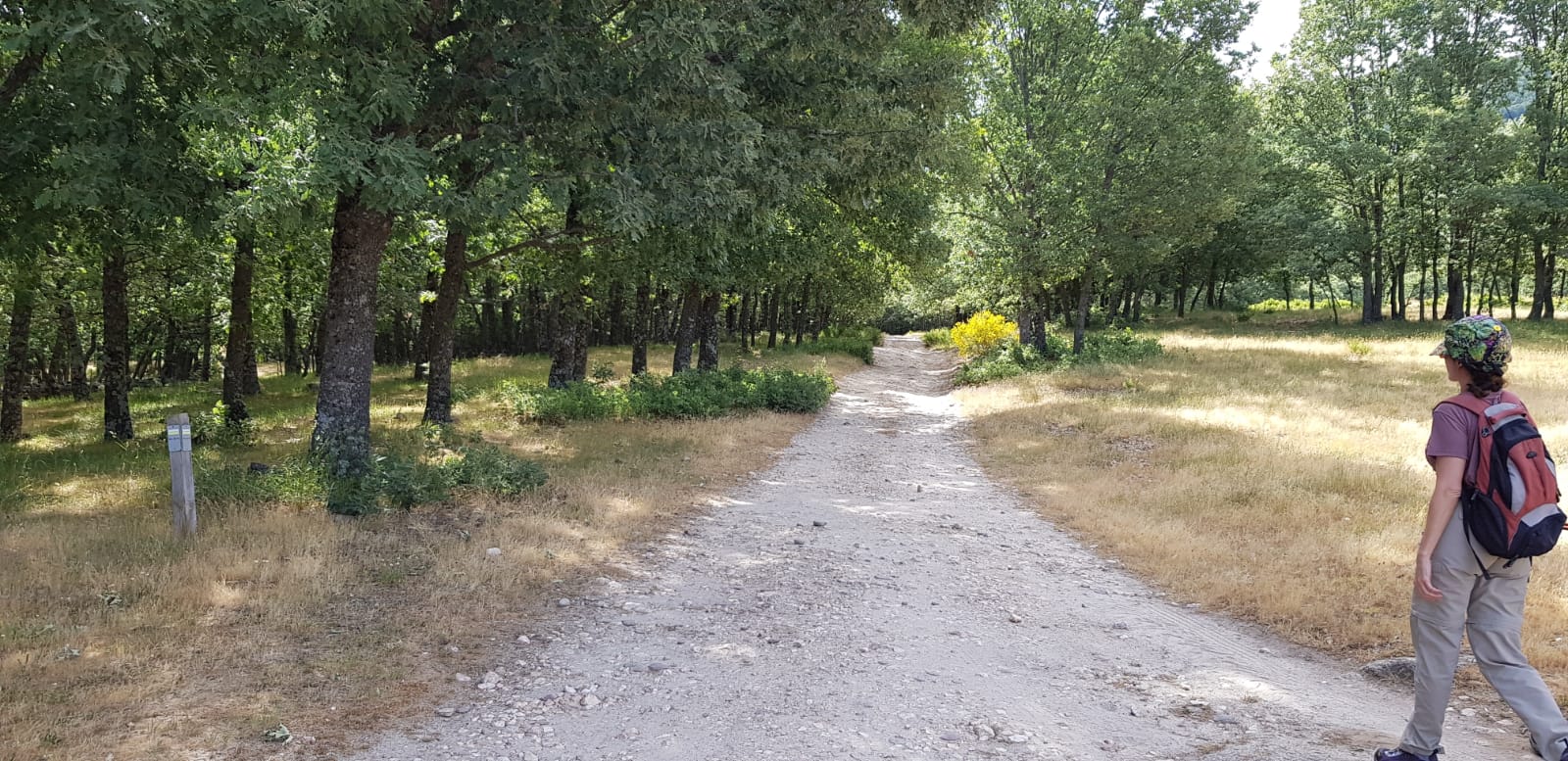 Salimos del aparcamiento (1178 metros de altitud), a través de un joven robledal, a la sombra de sus bonitos ejemplares. La temperatura es muy agradable con intervalos nubosos. Vamos calentando motores para lo que esperamos sea una larga y calurosa jornada. Iniciamos la ascensión por el camino arbolado de Peñagorda, siguiendo la senda PR-AV-16, hasta llegar a la garganta propiamente dicha, por un camino rural utilizado para las labores de labranza y ganadería.