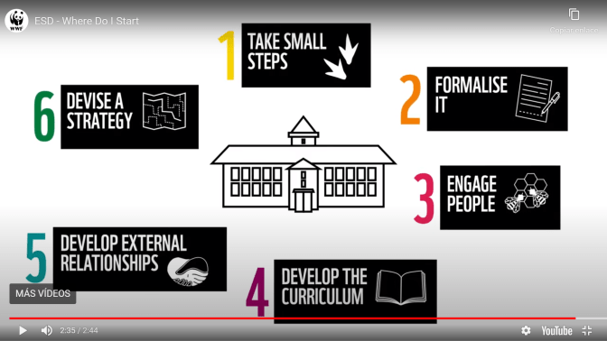 No debemos quedarnos únicamente en el aula, sino que debemos ir más lejos para observar el problema desde una perspectiva más global. En el siguiente vídeo podéis ver las pautas, que el Aprendizaje para el Desarrollo Sostenible debería tener, según la organización WWF.