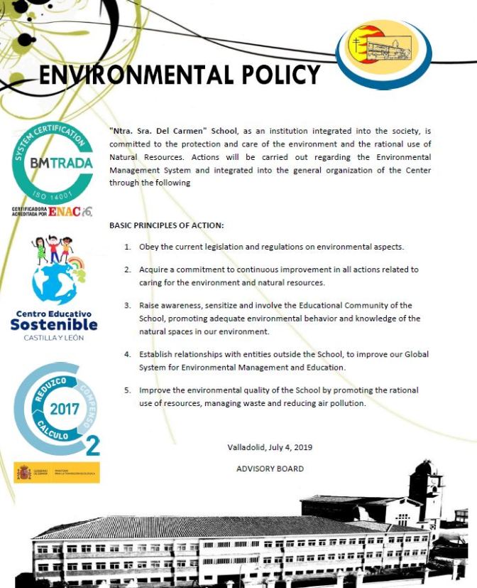 The spirit of the Global System for Environmental Education and Management involves complying with current legislation and regulations on environmental aspects, as well as other requirements that our School considers appropriate, acquiring a commitment to continuous improvement in all relationships related to the care of the environment and natural resources, raise awareness, sensitize and involve the entire Educational Community, promoting appropriate environmental behaviour and knowledge of the natural spaces in our surroundings, establish relationships with institutions outside the School and improve the environmental quality of the School by promoting the rational use of resources, precisely managing waste and thus contributing to the reduction of pollution.