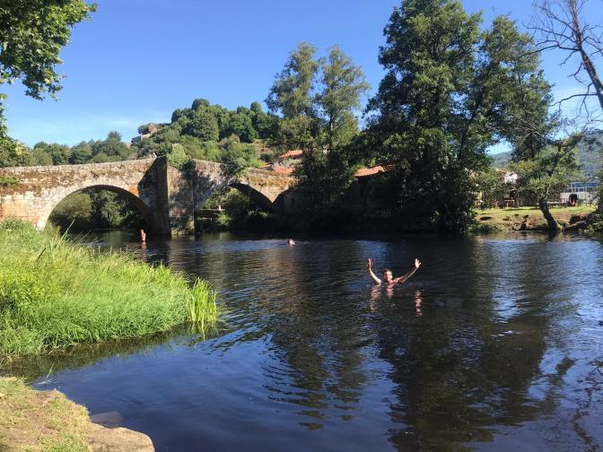 Por la tarde fuimos a Allariz, un bonito pueblo al lado de Ouerense, que nos sorprendió con un casco histórico muy bonito y cuidado, plagado de tiendas. Aunque para ser sincero, lo que más me gustó del pueblo fue la asombrosa playa fluvial, con un río súper limpio y mucha hierba al margen. La gente iba allí a bañarse por lo que decidimos probarlo ¡el agua estaba estupenda!