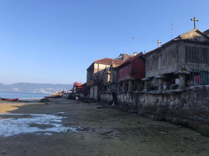 Tras la pateada de por la mañana (unos 20km rodeando la isla) disfrutamos de un poco de playa y nos dirigimos a Combarro. Este es un pequeño pueblo con un centro muy bien conservado lleno de casas de piedra y calles estrechas, con muchos hórreos, donde acabamos la jornada con un pulpo y unas sardinas en una terraza asomados a la Ría, no sin antes volver a cambiar las aguas de la caravana.