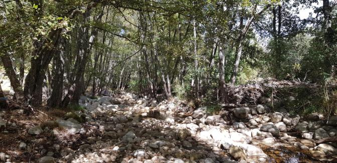 Seguimos ascendiendo hasta que los hitos e indicadores nos hacen cruzar la corriente de agua. En esta época del año el riachuelo baja prácticamente sin agua con lo que no es muy complicado cruzar al otro lado. Creemos que no será tan fácil en otras estaciones.