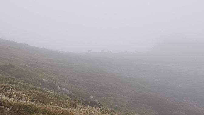 Desde este pico continuamos por la cordal hasta el siguiente de nuestras cumbres, Peña Salgada, con 1976 metros de altitud. Por el camino, pequeños grupos de rebecos nos contemplan desde la distancia, escondidos en la cortina de la niebla. La subida no tiene ninguna dificultad aunque no veamos prácticamente nada durante la ascensión.