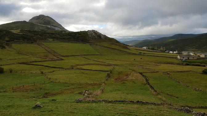 Descendemos a través de un sendero que nos cuesta encontrar, hasta el collado donde se halla la braña de Valdecuélebre. Una de las brañas más antiguas con numerosos restos de cabañas y con algún corro de piedra. A partir de este momento parece que despeja un poco y nos deja contemplar algunos retales puntuales del impresionante paisaje. ¡Sólo un espejismo!