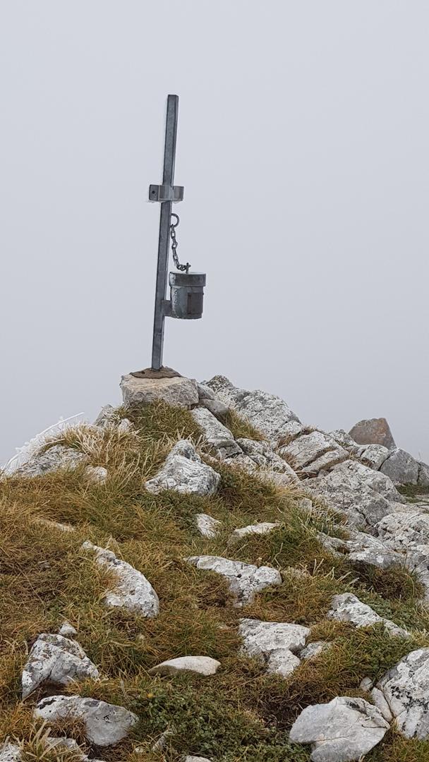 Al coronar esta peña situada a unos 1946 metros de altitud nos encontramos con una sencilla cruz metálica y un buzón de cumbres. Nos comentan que “El Peña Salgada es uno de los puntos panorámicos más destacados de la zona con vistas de los principales picos de León y Somiedo”… ¡Nosotros no vemos un carajo!