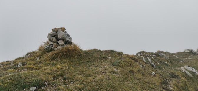 Después de pasar la braña subimos a la cumbre del Pico Alto, situado a 1840 metros de altitud, donde la niebla hace que no podamos disfrutar de uno de los puntos panorámicos más espectaculares de la zona. Seguimos camino, un poco desesperados por el mal tiempo, para ascender fácilmente hasta Peña Gúa, situada a 1679 metros, pasando por el collado Corrotrapas.