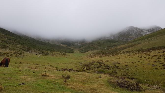 Comenzamos subiendo a través de la Vega Ordial, bordeando cumbres como el Alto de los Cumales y El Diente, con numerosos caballos que nos miran curiosos ¿Quiénes son estos zumbados que por segundo día se lanzan a hacer rutas por estos lares con esta niebla tan cerrada?