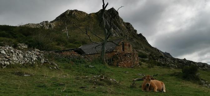 Nuestro segundo día por el Parque Natural de Somiedo nos acercaremos a visitar las Brañas de Mumián. Se trata de una de las brañas más importantes de Somiedo y nos enseñarán como era la vida durante los siglos anteriores en esta zona. Salimos en un día lluvioso del pueblo vaqueiro de Santa María del Puerto donde hemos aparcado nuestros coches. La ruta es lineal, por lo que previamente hemos dejado uno de los coches, con el que subiremos posteriormente al finalizar la ruta, en LLamardal. Aunque el cielo está nublado como el día anterior las expectativas son mucho más halagüeñas. Estamos a unos 1490 metros de altitud. Se trata de uno de los pocos pueblos de vaqueiros de alzada, vaqueiros que a diferencia de otros ganaderos de la zona que subían el ganado a las brañas a lo largo del día, practicaban la trashumancia.