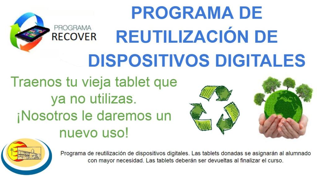 Desde el Colegio Ntra. Sra. del Carmen lanzamos el Programa «RECOVER» de Reutilización de Dispositivos Digitales para dar una segunda vida a aquellos dispositivos electrónicos que ya no utilizamos y que se nos han quedado obsoletos.