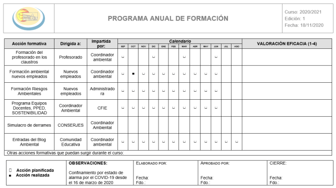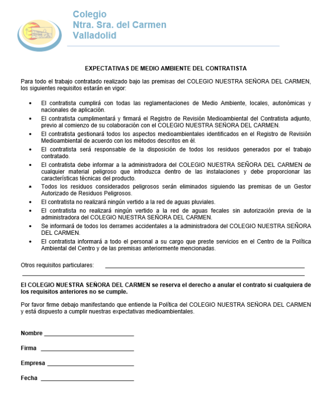 Este plan pretende implicar y responsabilizar a todo el personal en el desarrollo de una correcta Gestión Ambiental. El Centro proporciona a todas las personas que realizan trabajos en el colegio, que afecte al desempeño ambiental y a la capacidad para cumplir los requisitos legales, los siguientes aspectos: