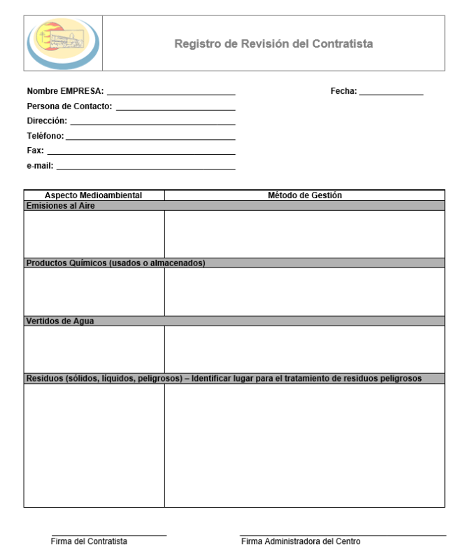Para garantizar la correcta gestión de los residuos generados por las empresas subcontratadas, la Administradora del Centro entrega a cada contratista un modelo de Expectativas de Medio Ambiente del Contratista, en el que se describen las responsabilidades y métodos de actuación ante los residuos generados, junto con el Registro de revisión del Contratista. Además, se les entregará junto a estos dos documentos la Política Ambiental del Centro.