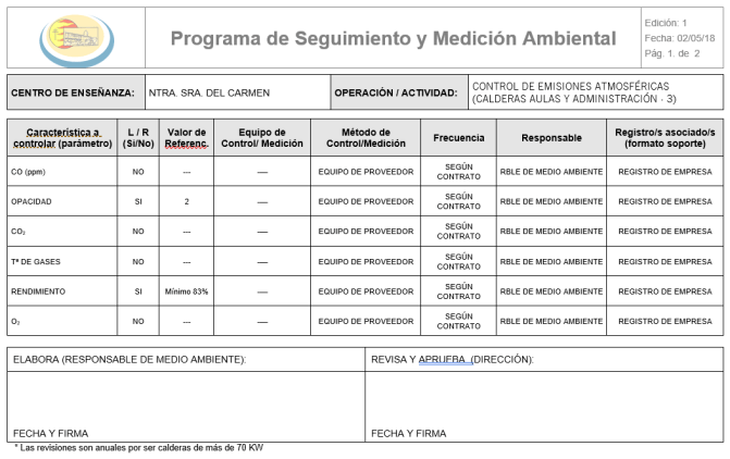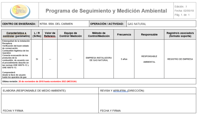 El Colegio controla y mide de forma regular las características clave de las operaciones y actividades que puedan tener un impacto significativo en el medioambiente, incluyendo el registro de la información de seguimiento del funcionamiento de los controles operacionales relevantes y de la conformidad con los objetivos ambientales. Los equipos de inspección utilizados para la realización de las operaciones de seguimiento y medición están correctamente calibrados.