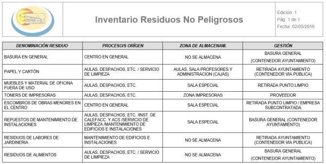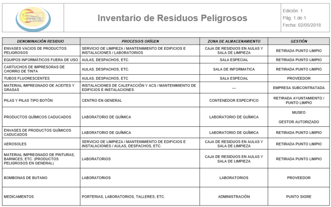 Algunos de los residuos generados en el Centro por las actividades de limpieza o de mantenimientos estarán clasificados como Residuos Peligrosos por la legislación y reglamentación aplicable. Se dispone de un Inventario de Residuos Peligrosos del Centro y un Registro de Residuos Peligrosos generados en el Centro.