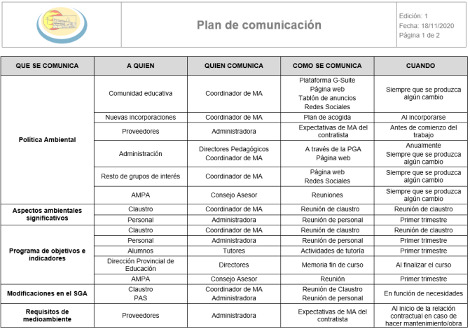 El Colegio comunica externamente e internamente, entre los diversos niveles y funciones del centro, la información pertinente del Sistema de Gestión Ambiental incluidos los cambios en el Sistema de Gestión Ambiental. Se asegura que sus procesos de comunicación permitan que las personas que realicen trabajos bajo el control del colegio contribuyan a la mejora continua ambiental.