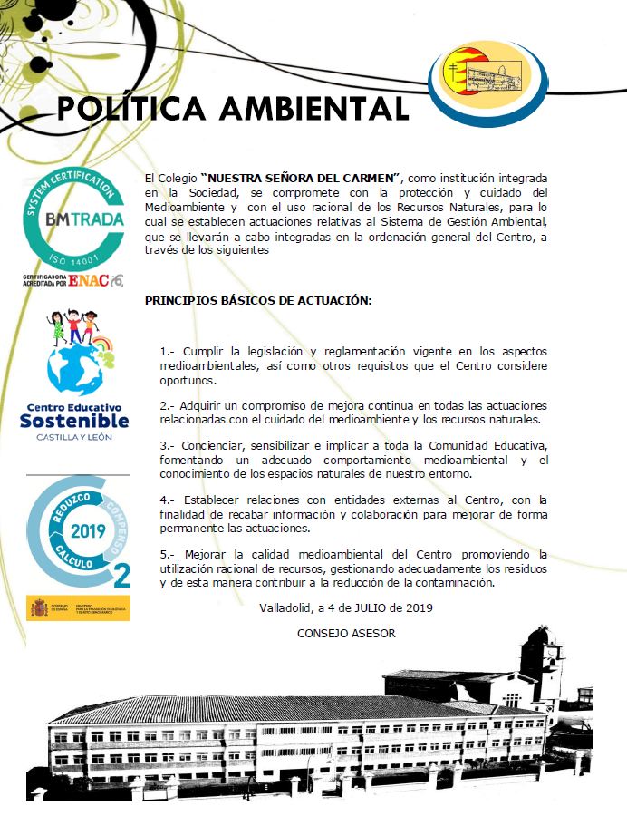 En los últimos años el Colegio Ntra. Sra. del Carmen ha venido preocupándose por la formación integral de nuestros alumnos y llevando a cabo iniciativas que permitieran la concienciación de la Comunidad Educativa de nuestro colegio, en el cuidado y conservación del medioambiente y en el uso racional de los recursos de que disponemos. La crisis sanitaria de la COVID-19 ha puesto al medioambiente frente a múltiples riesgos pero también frente a grandes y potentes oportunidades que no debemos dejar escapar.