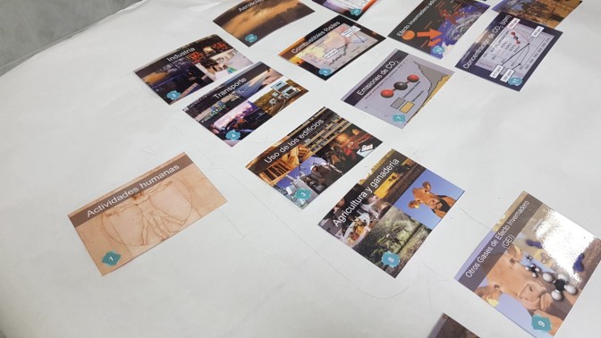 Los participantes han sido los alumnos de 4º ESO de Cultura Científica del Colegio, los cuales se han dividido en equipos para encontrar las relaciones de causa y efecto entre 42 cartas. Colectivamente, han construido un collage que explica el cambio climático. Usando no solo sus mentes racionales sino también su creatividad, han relacionado las distintas fichas de causas y efectos, de forma que han sido capaces de asimilar los distintos conocimientos de una forma más sencilla.