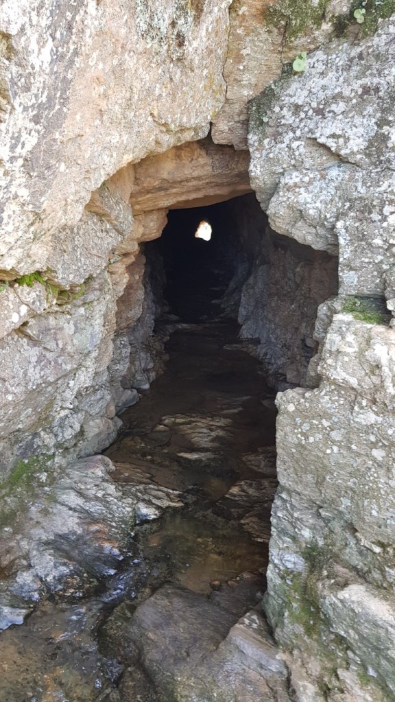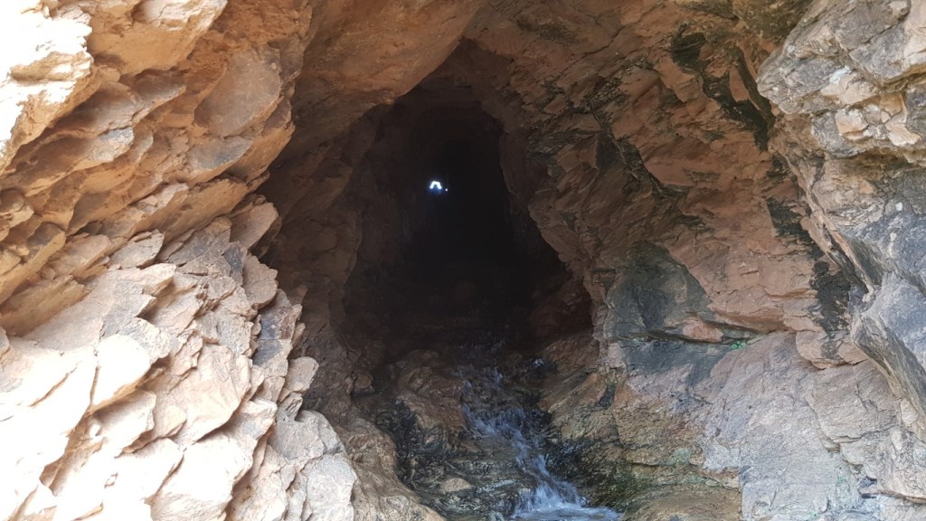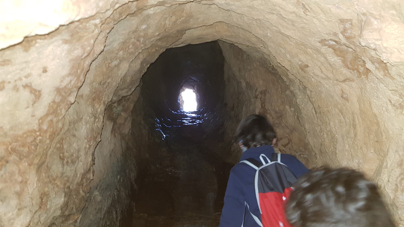 Para volver al pueblo atravesamos un estrecho túnel de unos 100 metros de longitud por el que discurre abundante agua, llegando a la parte superior de esta zona.