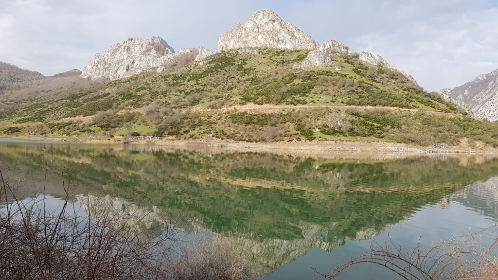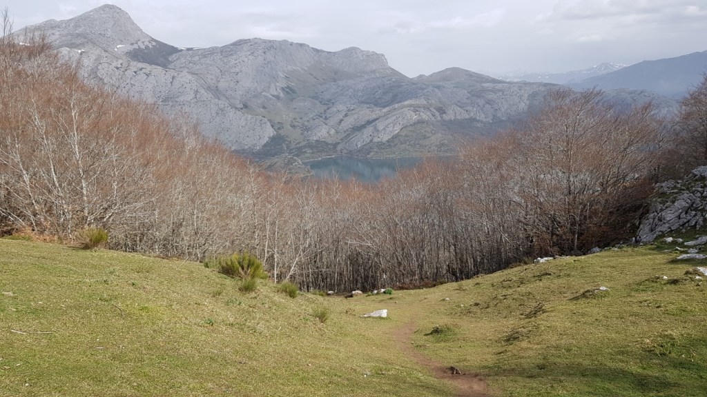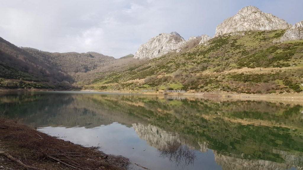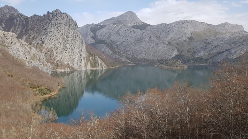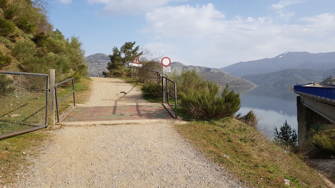 La ruta empieza desde el parking a 1115 metros de altitud sobre el nivel del mar, junto al viaducto de Riaño. Después de ponernos las botas de montaña, salimos a través de una puerta para el ganado, siguiendo el lateral del pantano. Caminamos a través de una pista forestal que rodea un tramo del embalse con un día esplendido.