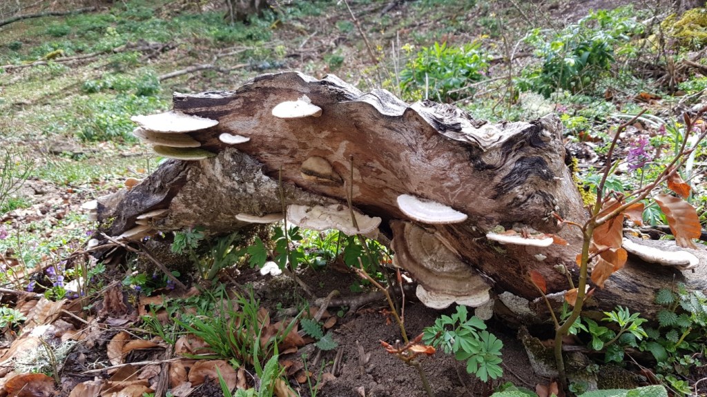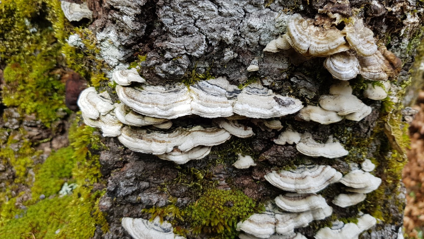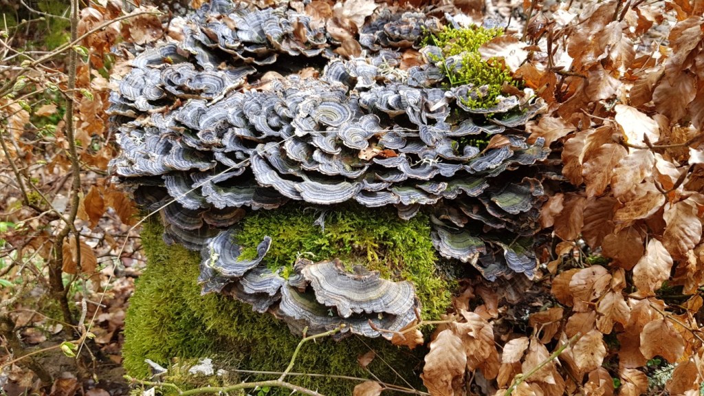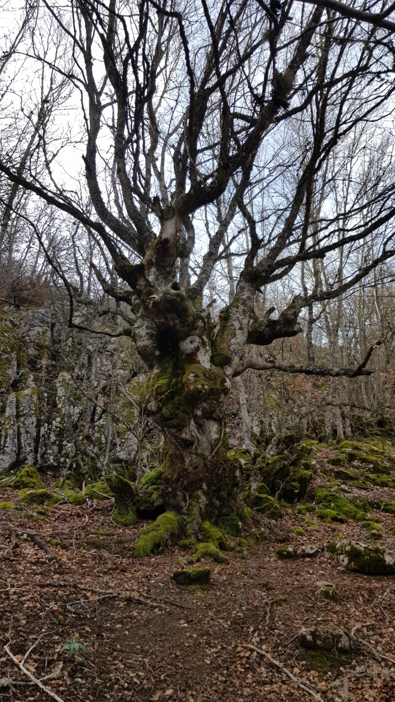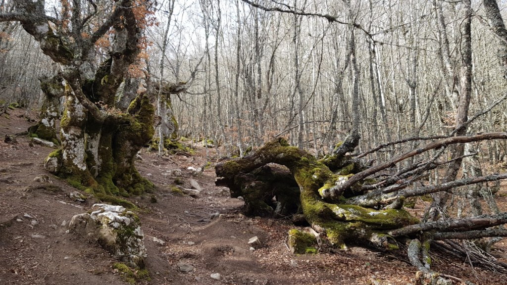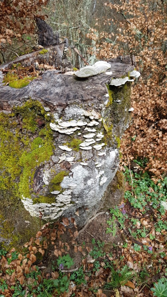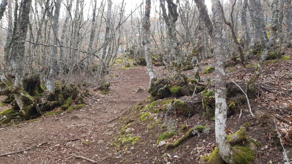 Desde el collado tomamos un sendero que sale por nuestra derecha para bajar nuevamente hasta el aparcamiento, por un espectacular hayedo con una curiosa colección de hongos en sus troncos.