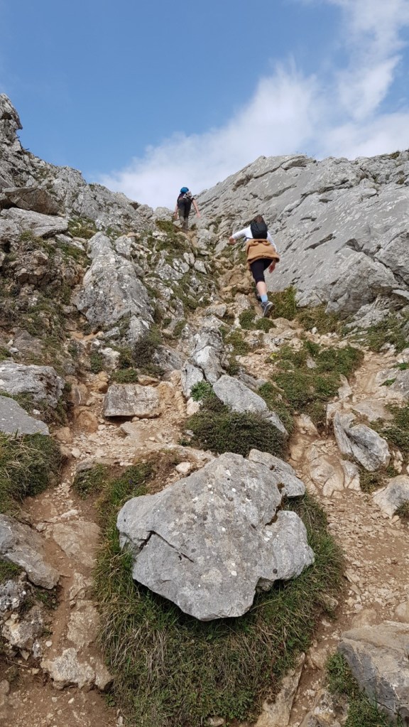 En este punto comenzamos la subida seria de la jornada. Se trata de una ascensión directa pegados a la pared. En varias ocasiones tendremos que hacer alguna pequeña trepada sin ningún tipo de dificultad hasta llegar a la canal que separa las dos cimas. Continuamos hacia la derecha hasta llegar a nuestro objetivo a 1679 metros de altitud.