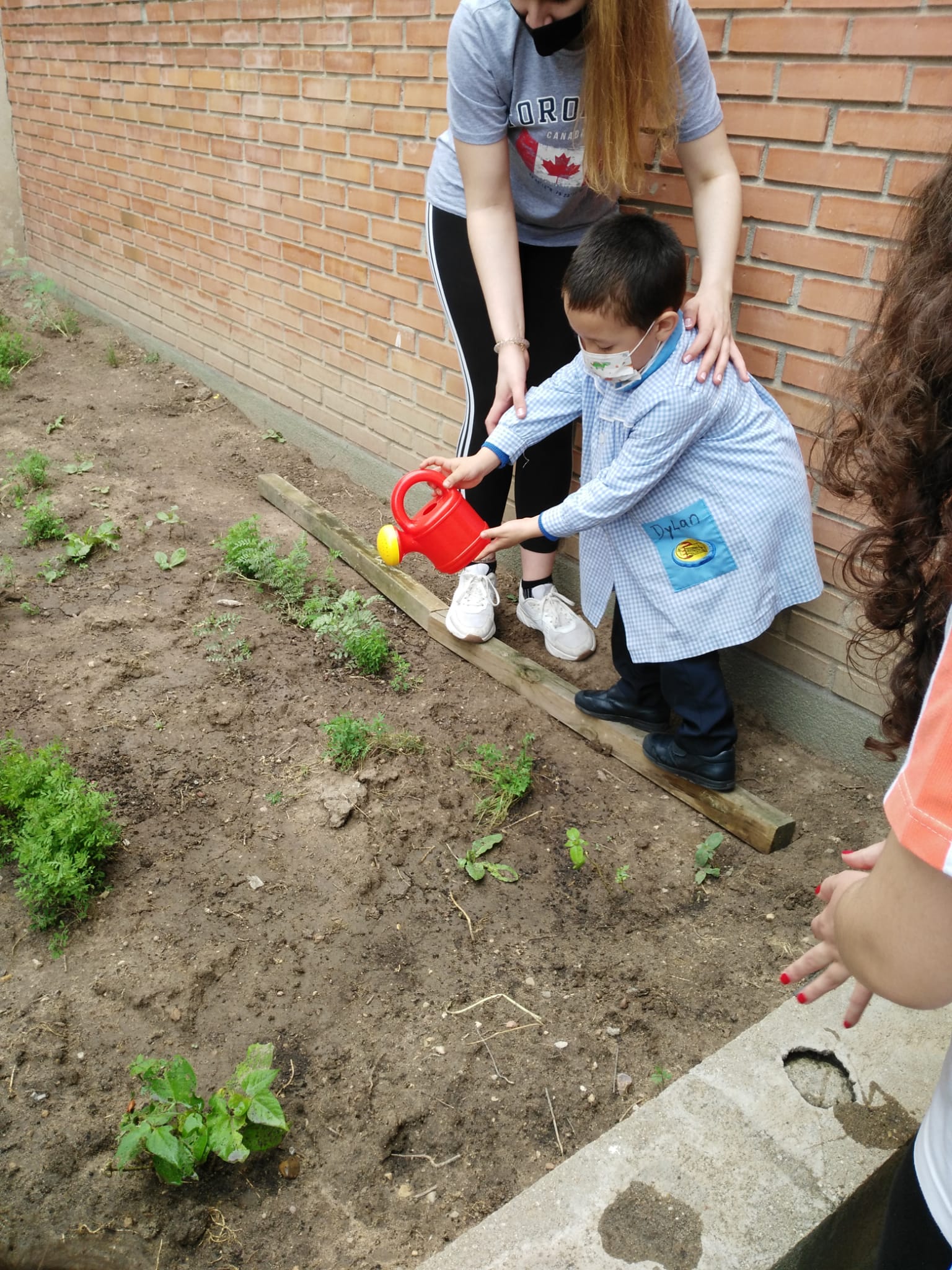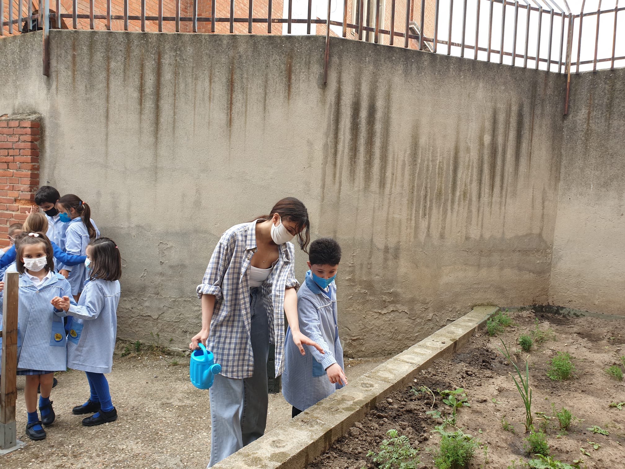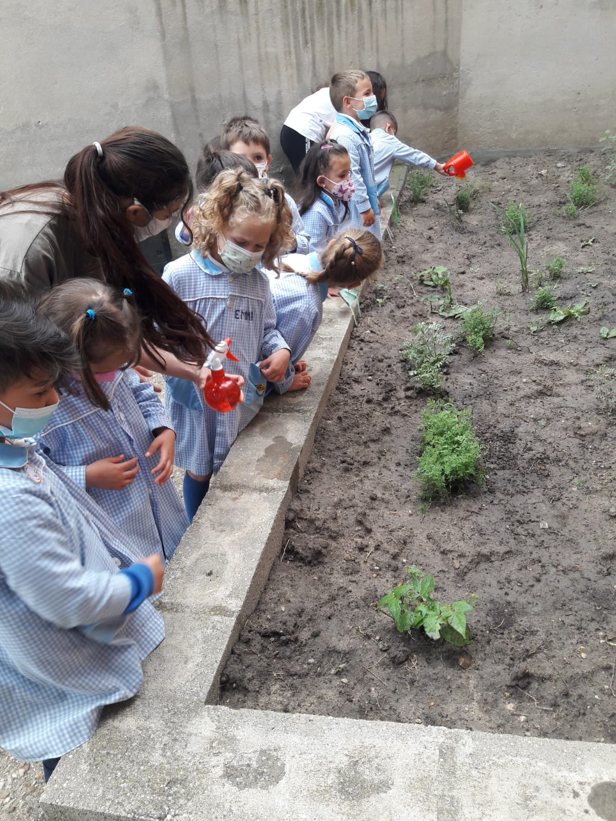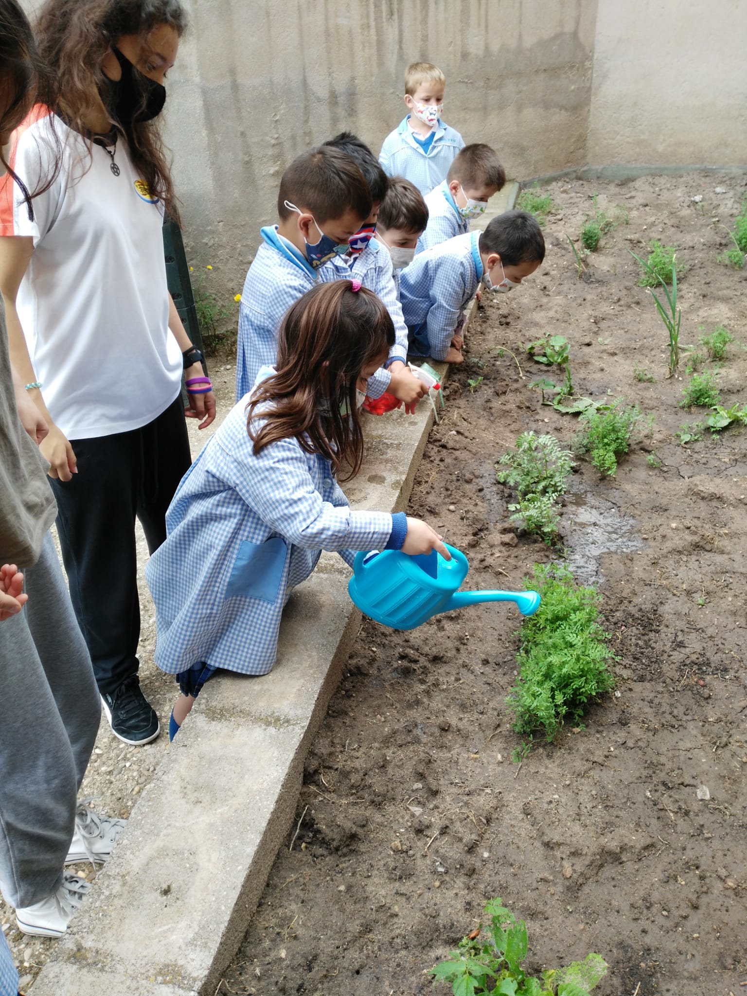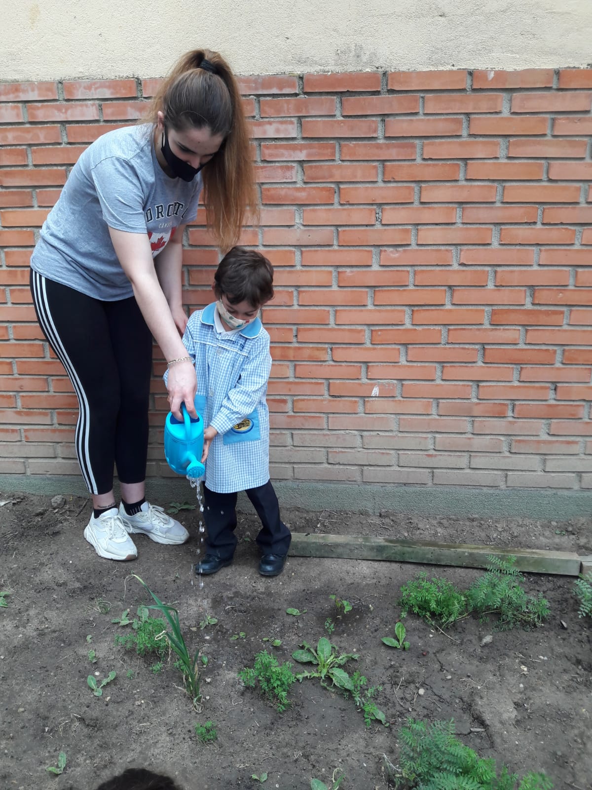 Los más pequeños han estado regando con unas pequeñas regaderas las distintas plantas que habían cultivado los días anteriores. No existe mayor aprendizaje para nuestros pequeños alumnos que ir viendo como crecen sus pequeñas plantas gracias a los cuidados que les ofrecen. Y no hay mayor satisfacción para nosotros que ver a los «mayores» ayudar a los «enanos» a mejorar sus competencias.