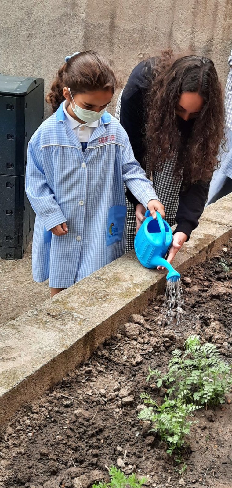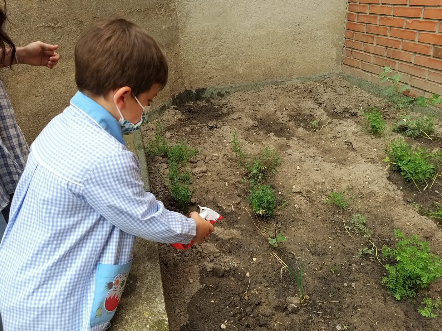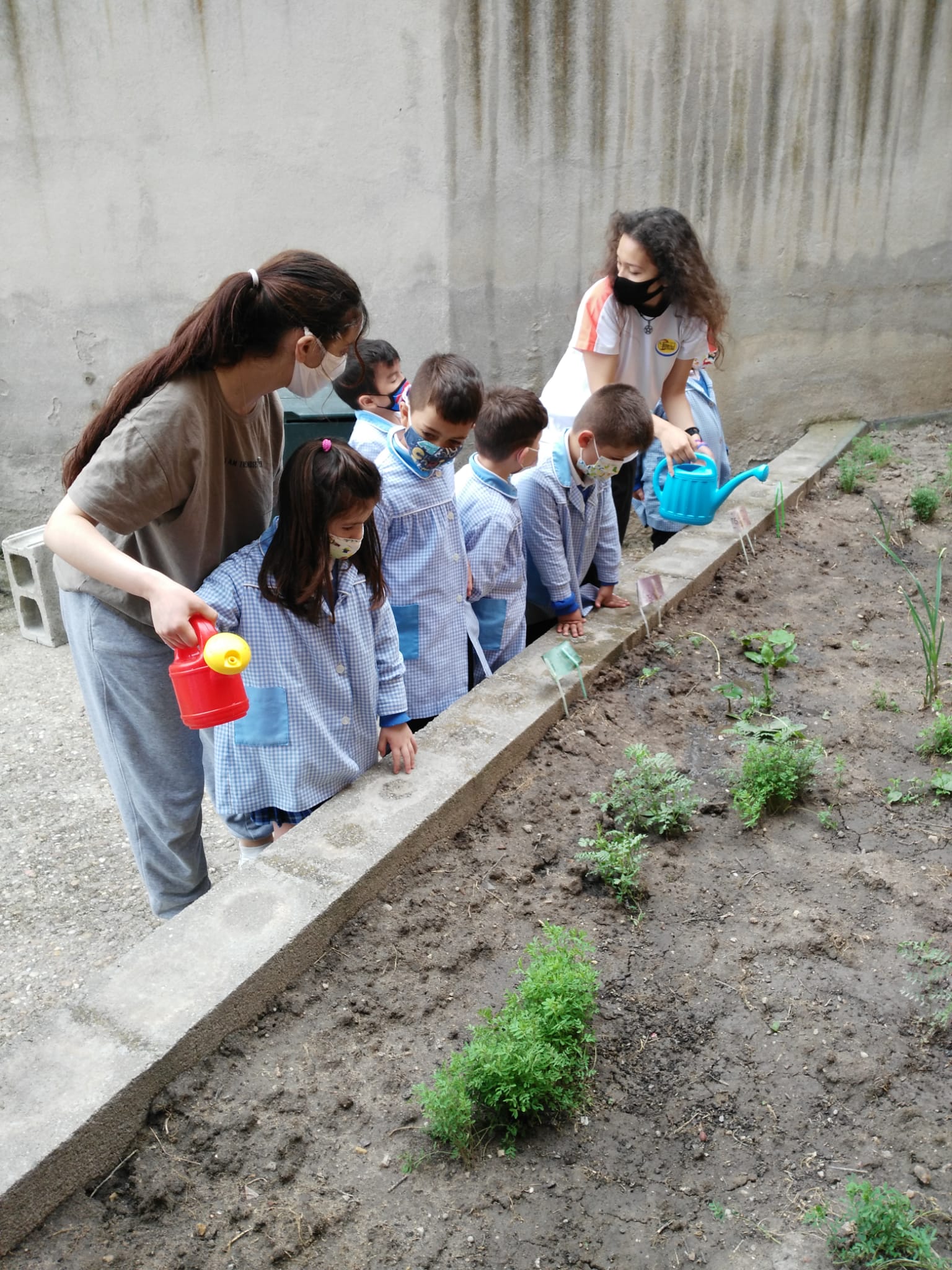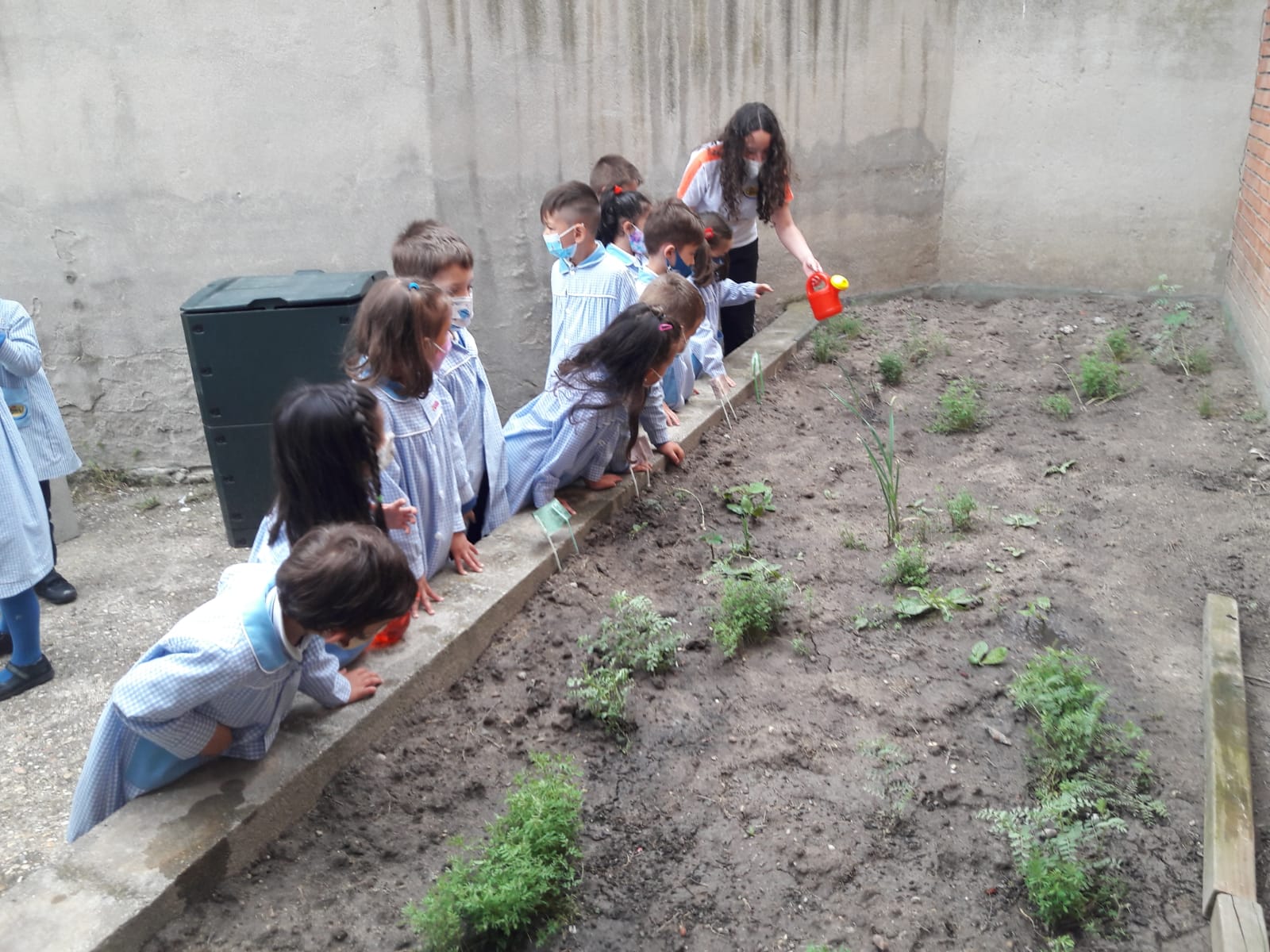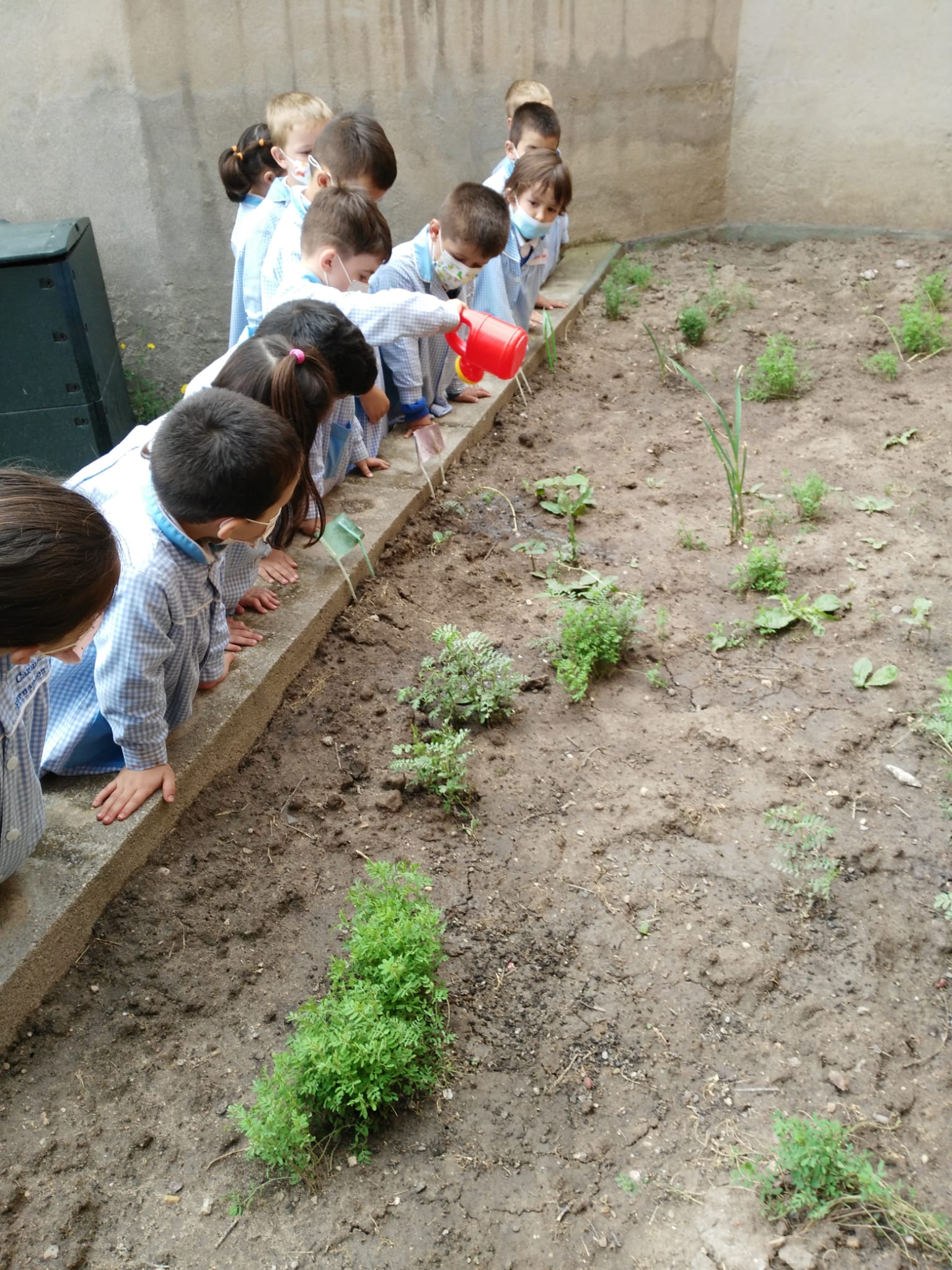 Los más pequeños han estado regando con unas pequeñas regaderas las distintas plantas que habían cultivado los días anteriores. No existe mayor aprendizaje para nuestros pequeños alumnos que ir viendo como crecen sus pequeñas plantas gracias a los cuidados que les ofrecen. Y no hay mayor satisfacción para nosotros que ver a los «mayores» ayudar a los «enanos» a mejorar sus competencias.