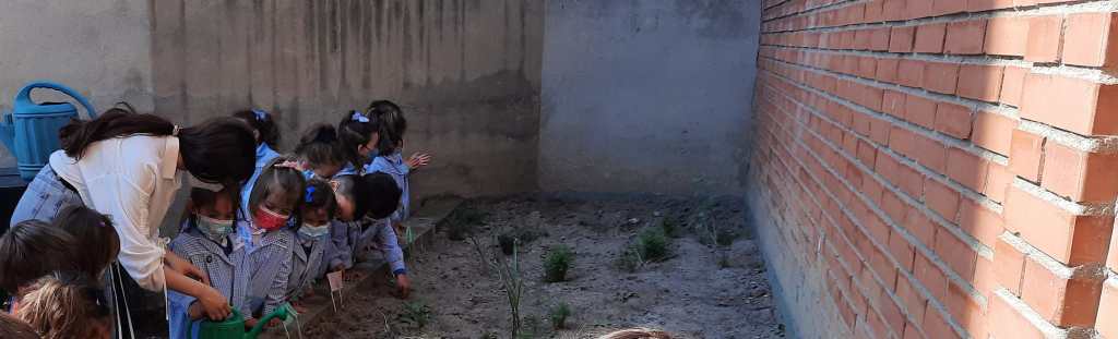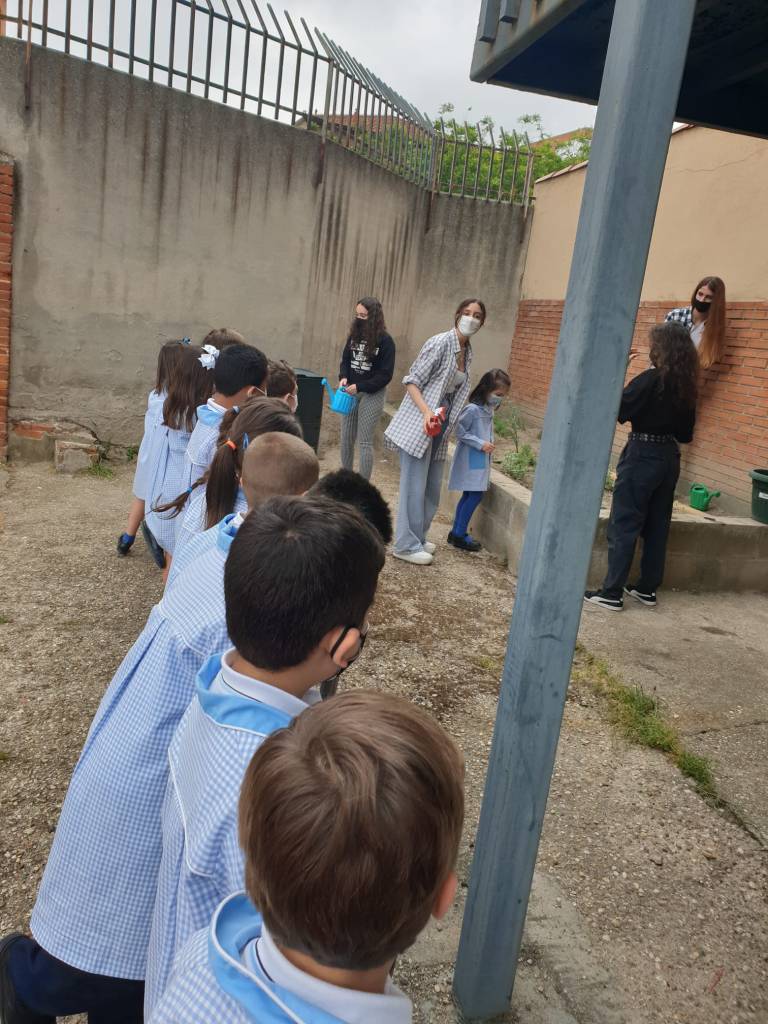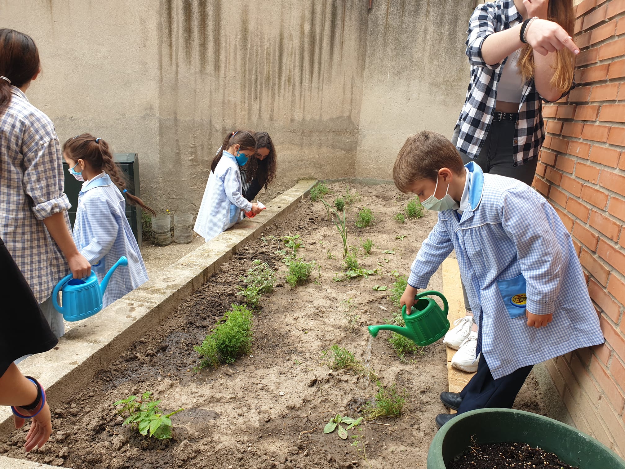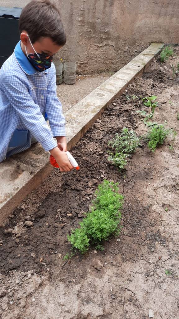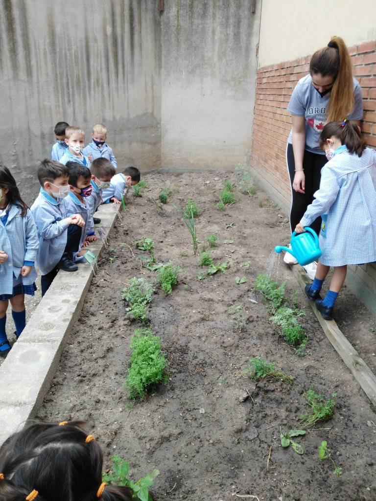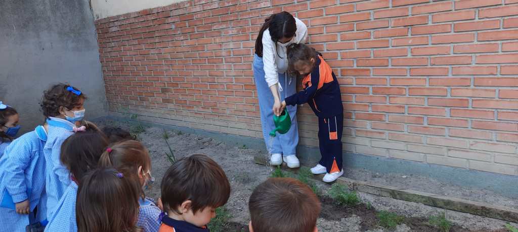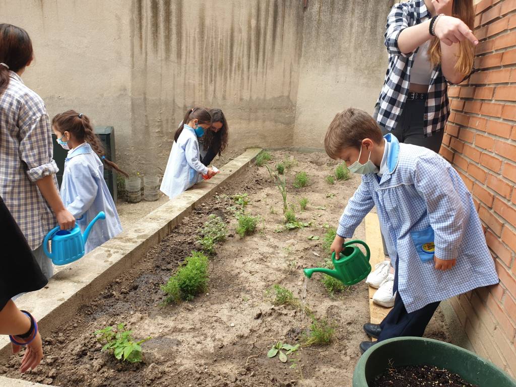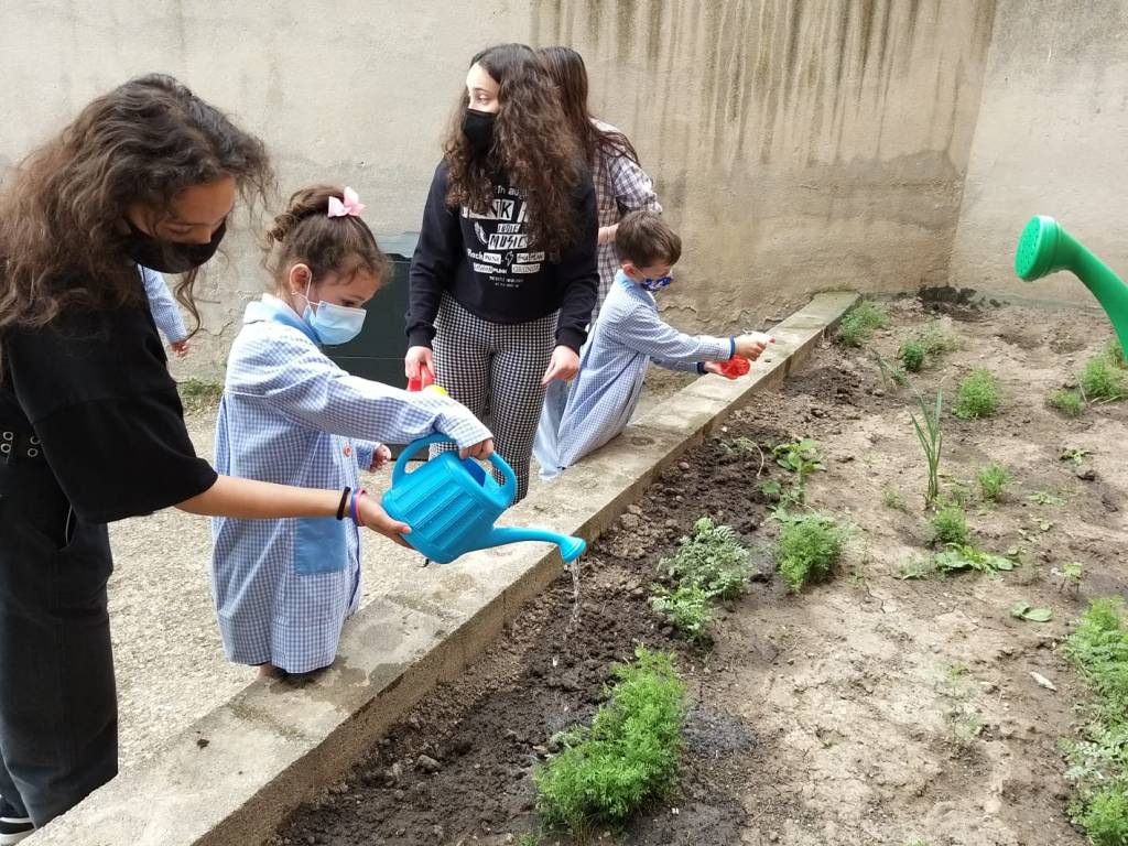 Los más pequeños han estado regando con unas pequeñas regaderas las distintas plantas que habían cultivado los días anteriores. No existe mayor aprendizaje para nuestros pequeños alumnos que ir viendo como crecen sus pequeñas plantas gracias a los cuidados que les ofrecen. Y no hay mayor satisfacción para nosotros que ver a los «mayores» ayudar a los «enanos» a mejorar sus competencias.
