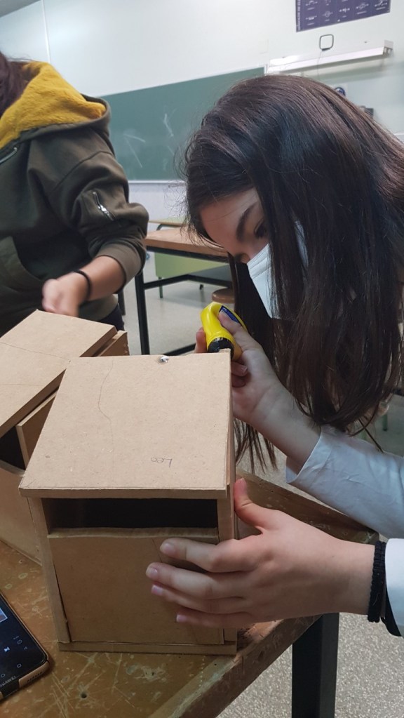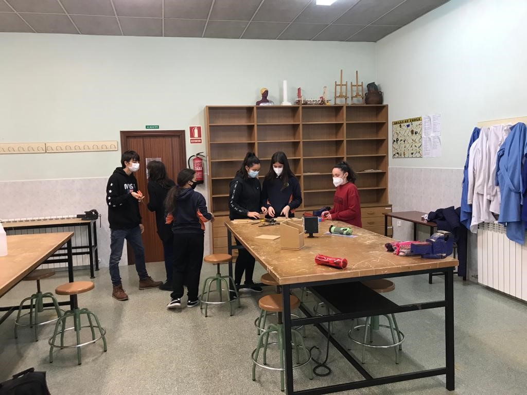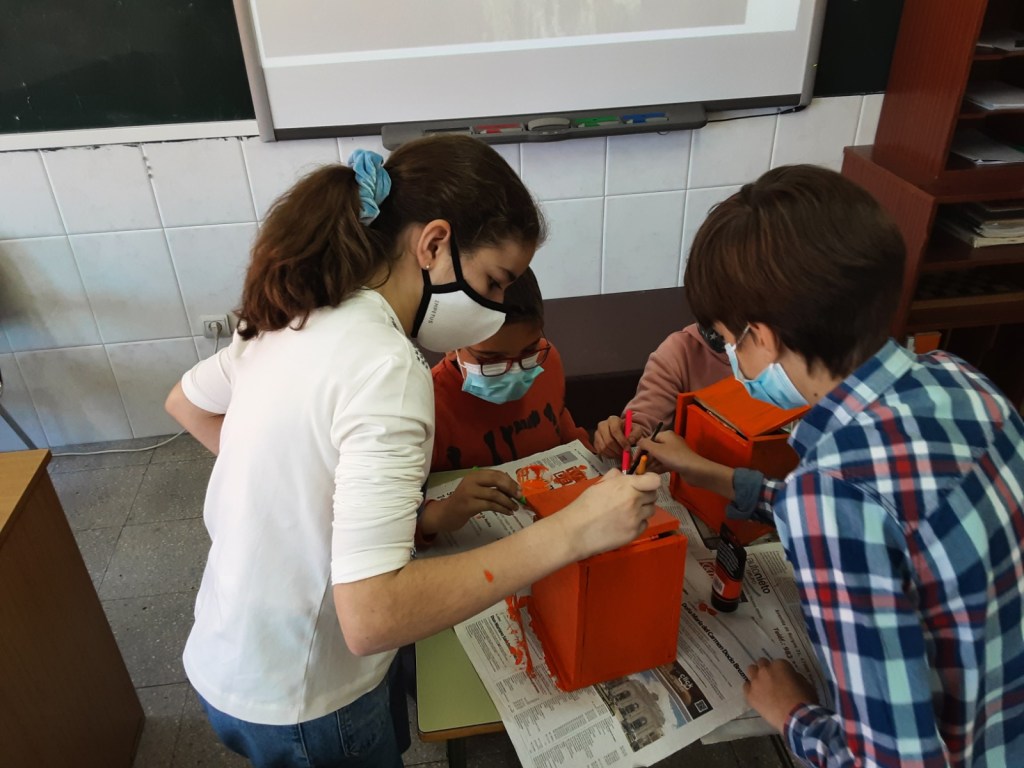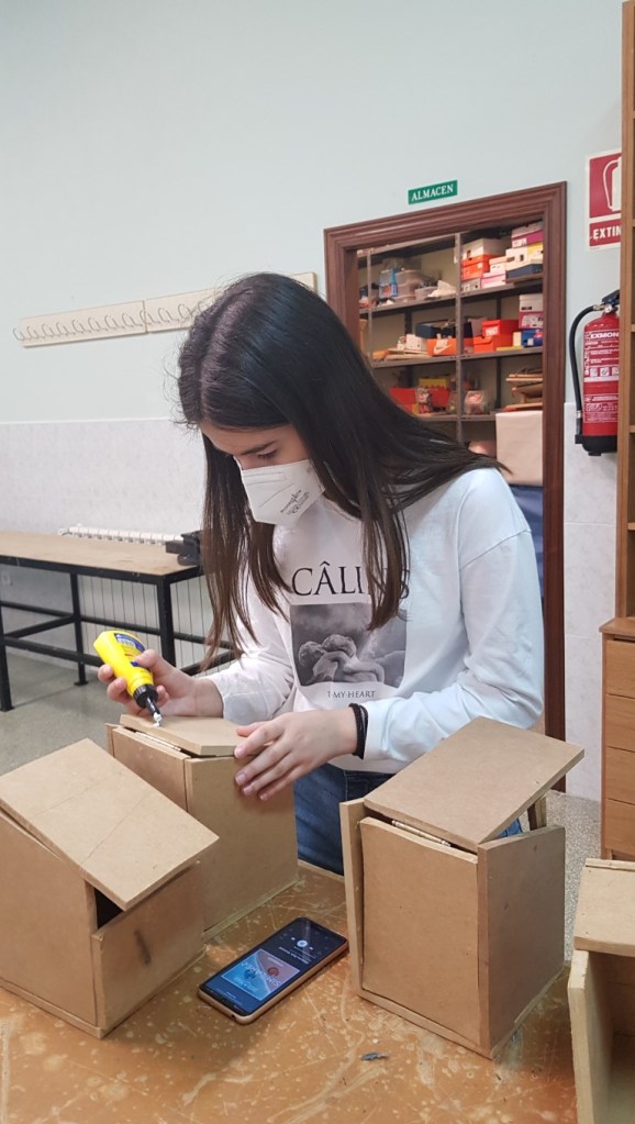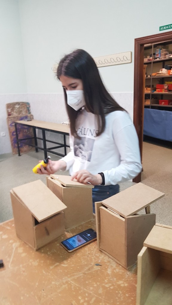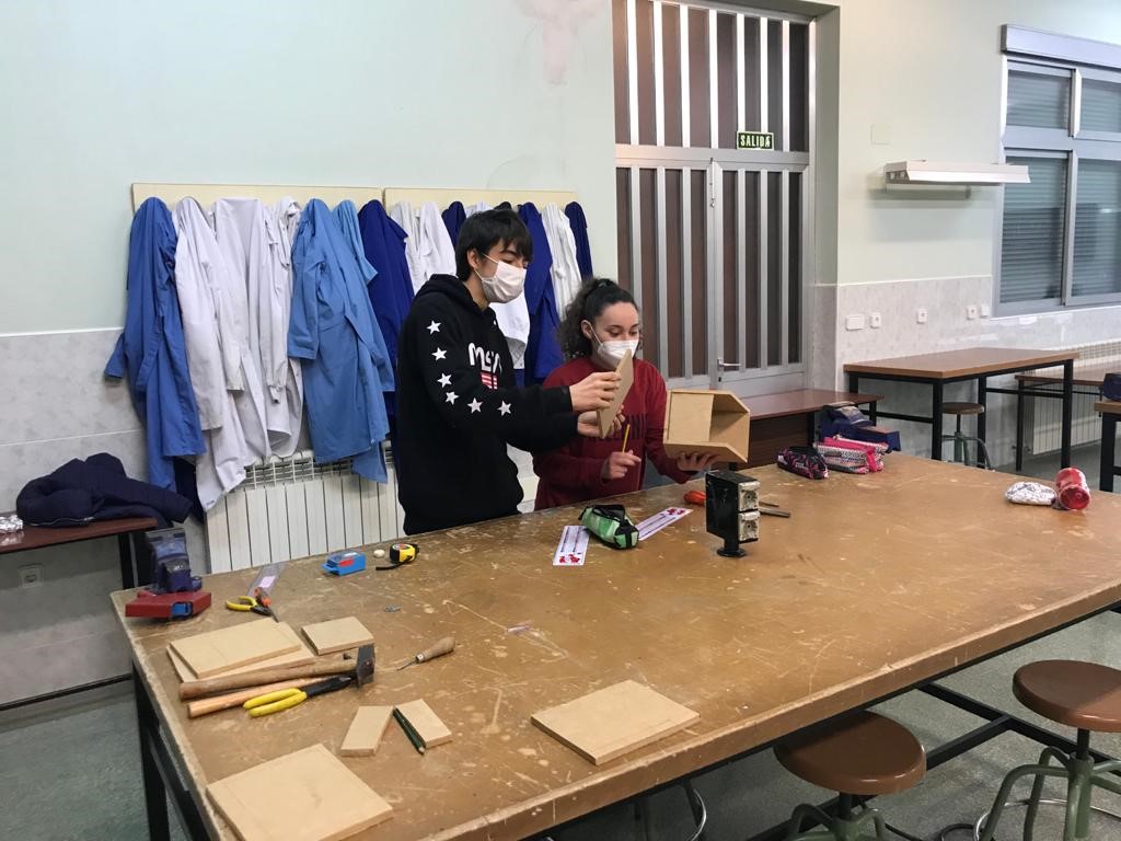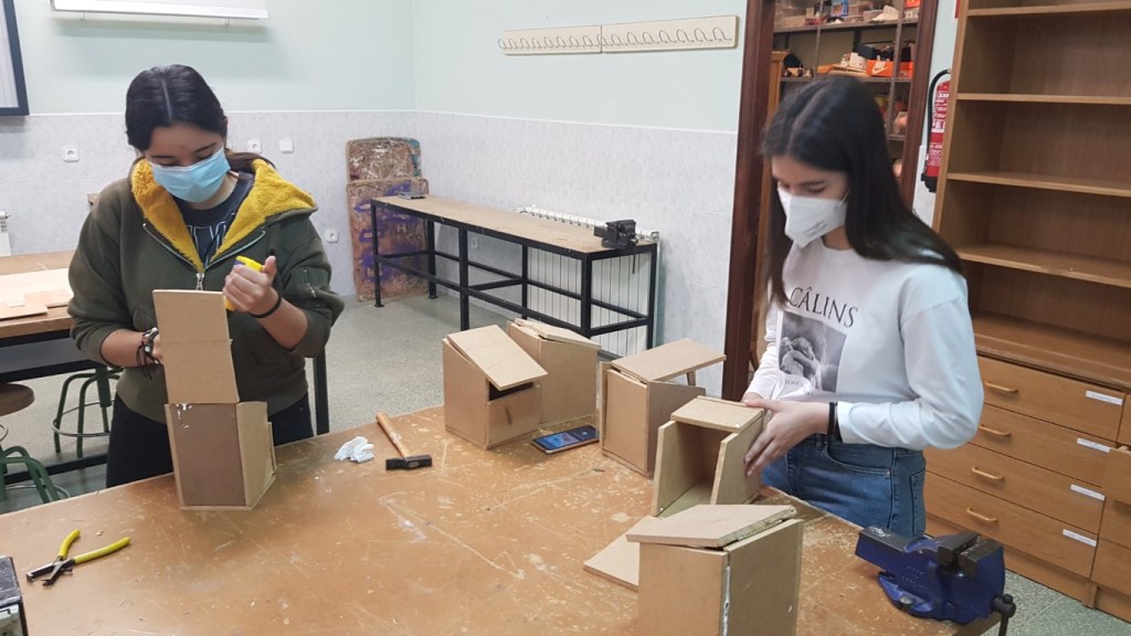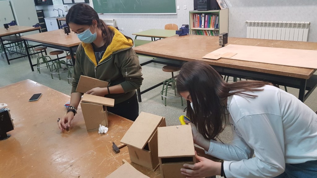 Días antes de las jornadas, un grupo de alumnos estuvo construyendo pajareras con materiales reutilizados con los profesores de tecnología.