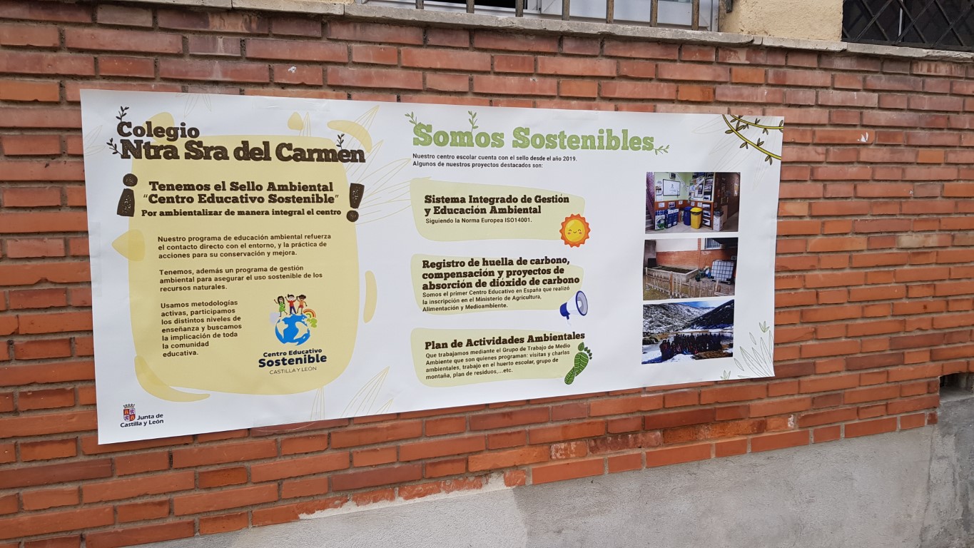 Comenzábamos las jornadas con la colocación en el Edificio de Educación Infantil y Primaria de una lona educativa suministrada por la Junta de Castilla y León a los centros reconocidos como «Centro Educativo Sostenible». El sello ambiental “Centro Educativo Sostenible”, constituye una vía para el reconocimiento de los centros docentes de Castilla y León comprometidos con la sostenibilidad ambiental. El distintivo está pensado para los centros docentes que cumplimos una serie de requisitos, entre ellos, desarrollar un programa de educación ambiental, disponer de un programa de gestión ambiental y asumir los compromisos de difusión de las memorias sobre nuestras actividades.