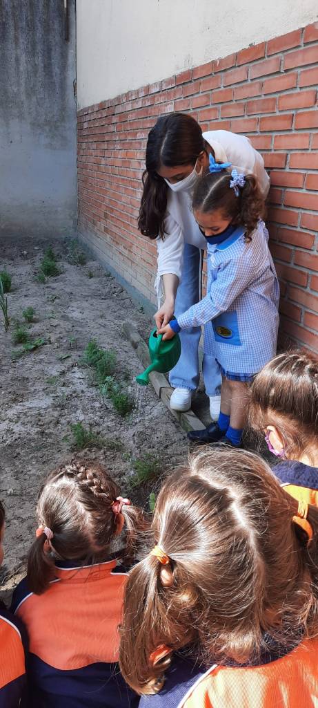 Los más pequeños han estado regando con unas pequeñas regaderas las distintas plantas que habían cultivado los días anteriores. Como comentamos en una entrada anterior, no existe mayor aprendizaje para nuestros pequeños alumnos que ir viendo como crecen sus pequeñas plantas gracias a los cuidados que les ofrecen. Y no hay mayor satisfacción para nosotros que ver a los “mayores” ayudar a los “enanos” a mejorar sus competencias.