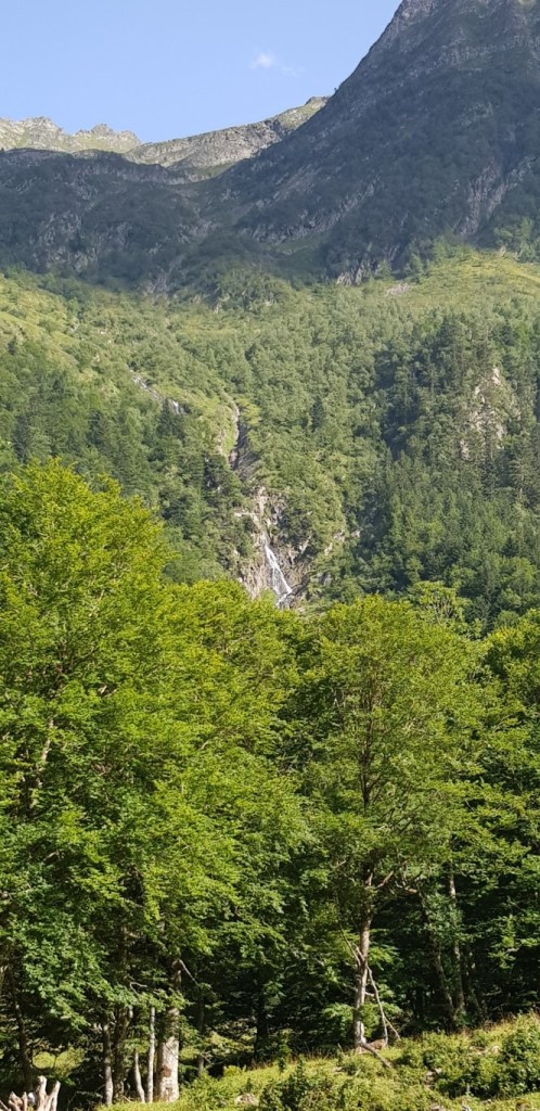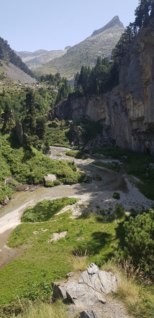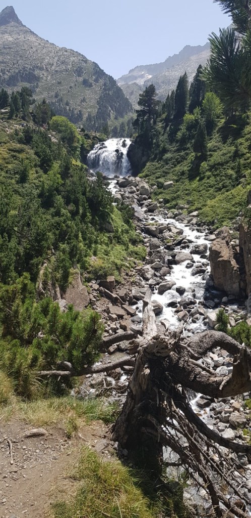 Una vez abajo, nos acercamos a contemplar la impresionante cascada Uelhs de Joeu. Las aguas de esta cascada proceden de las infiltraciones comentadas anteriormente de los glaciares de la Malaqueta y se pierden a traves del rio Garona en territorio francés.