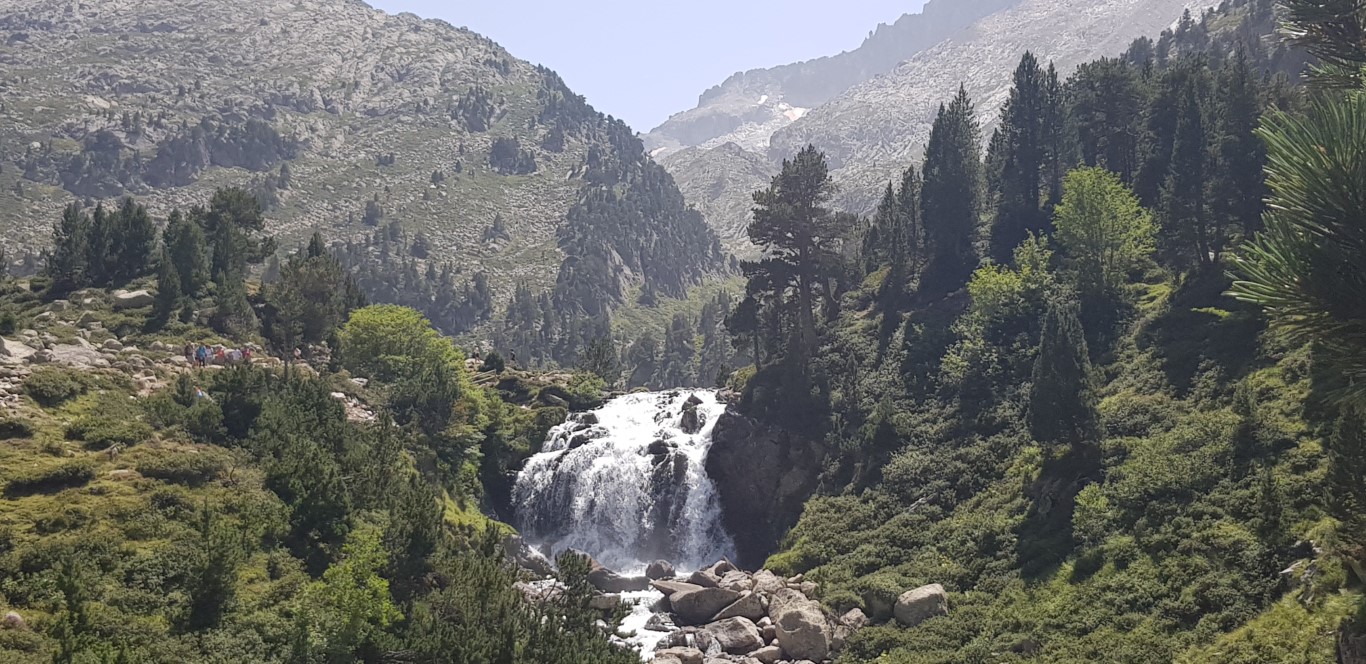 Una vez abajo, nos acercamos a contemplar la impresionante cascada Uelhs de Joeu. Las aguas de esta cascada proceden de las infiltraciones comentadas anteriormente de los glaciares de la Malaqueta y se pierden a traves del rio Garona en territorio francés.
