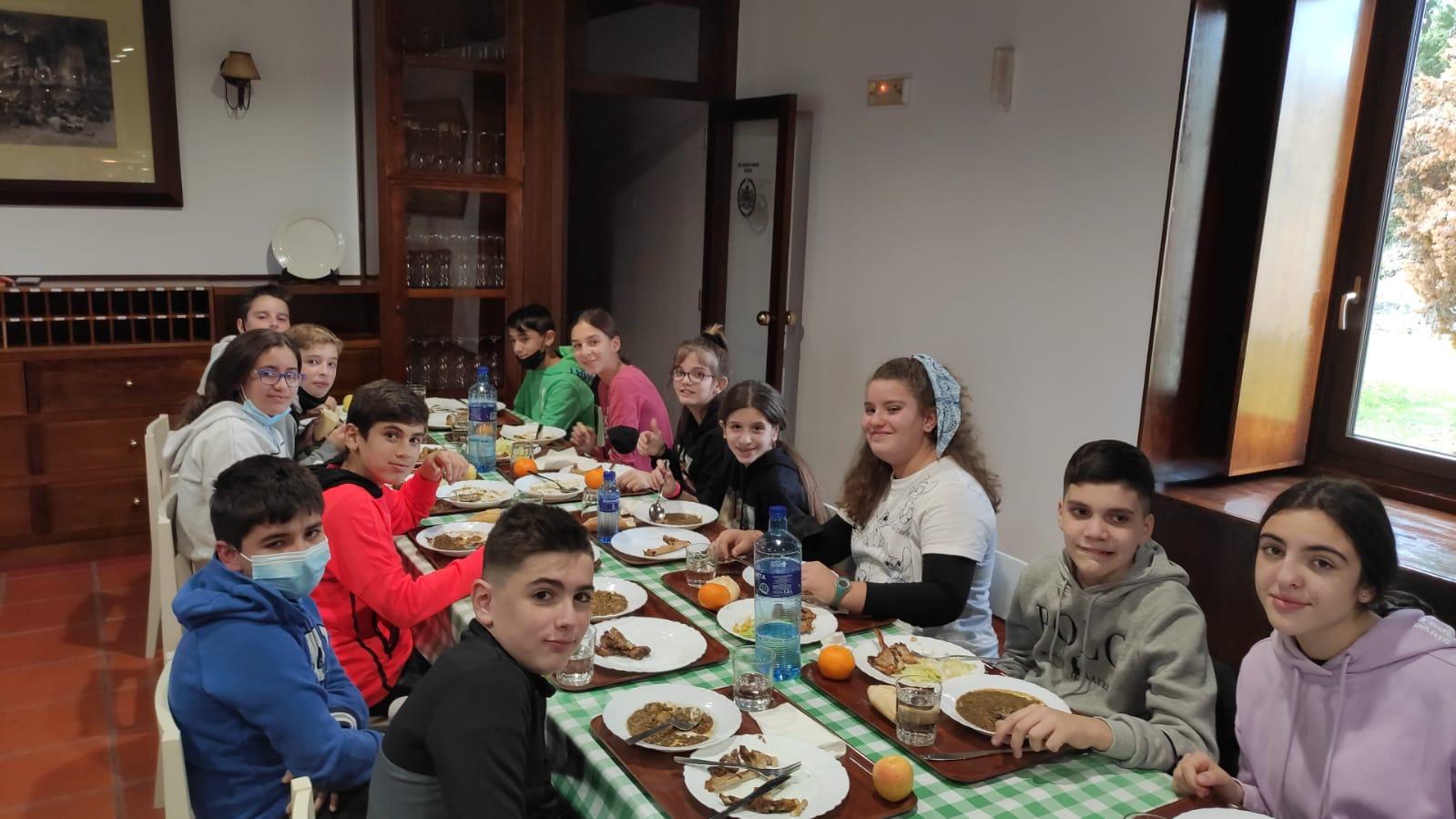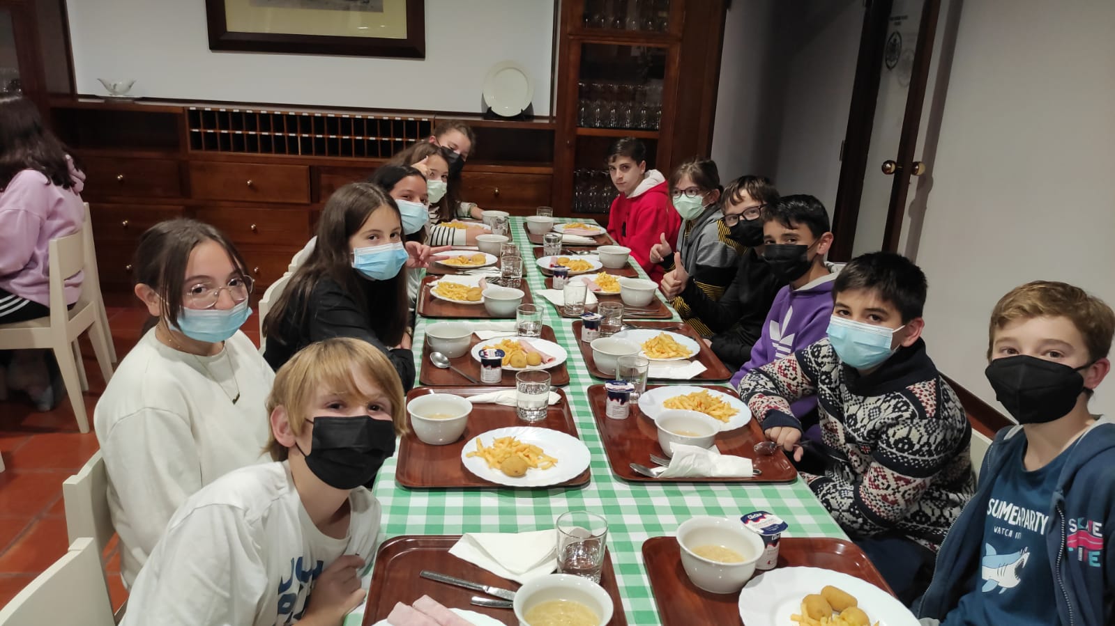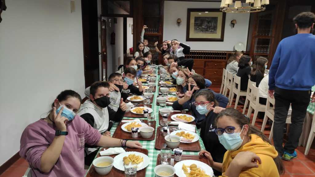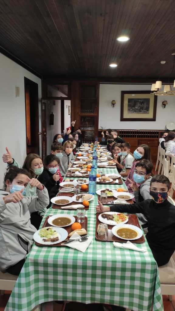 Una vez duchados procedemos a cenar: sopa, croquetas, patatas fritas o ensalada y yogur.