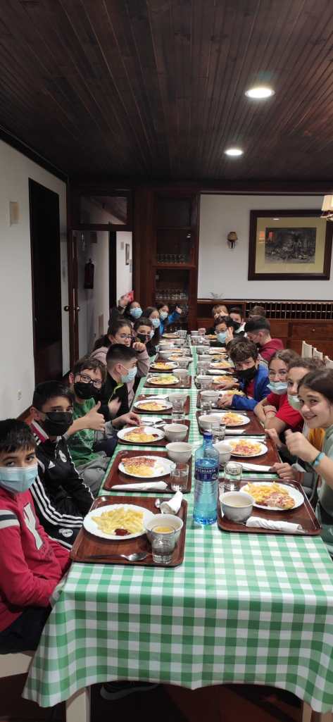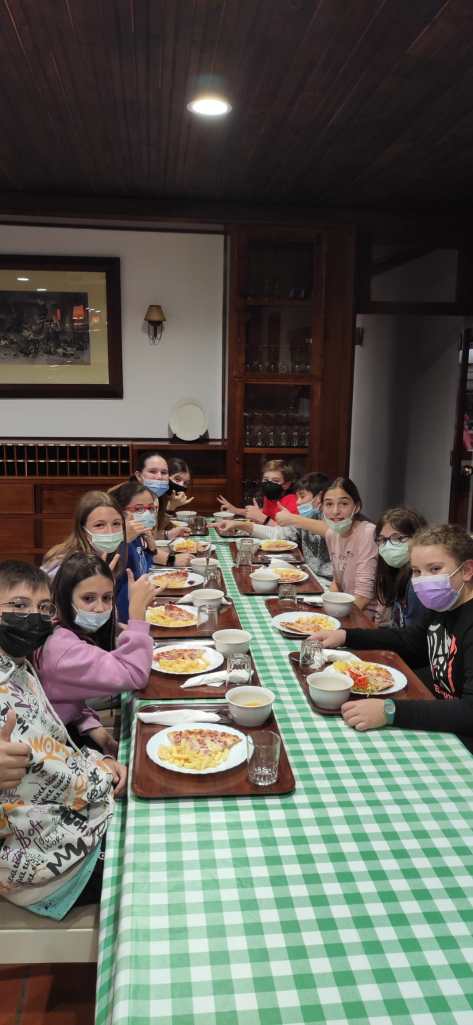 Empezamos con la cena. Puré de verdura y pizza. Lo mismo volvemos con algún kilo de más… ¡Algunos han repetido puré!