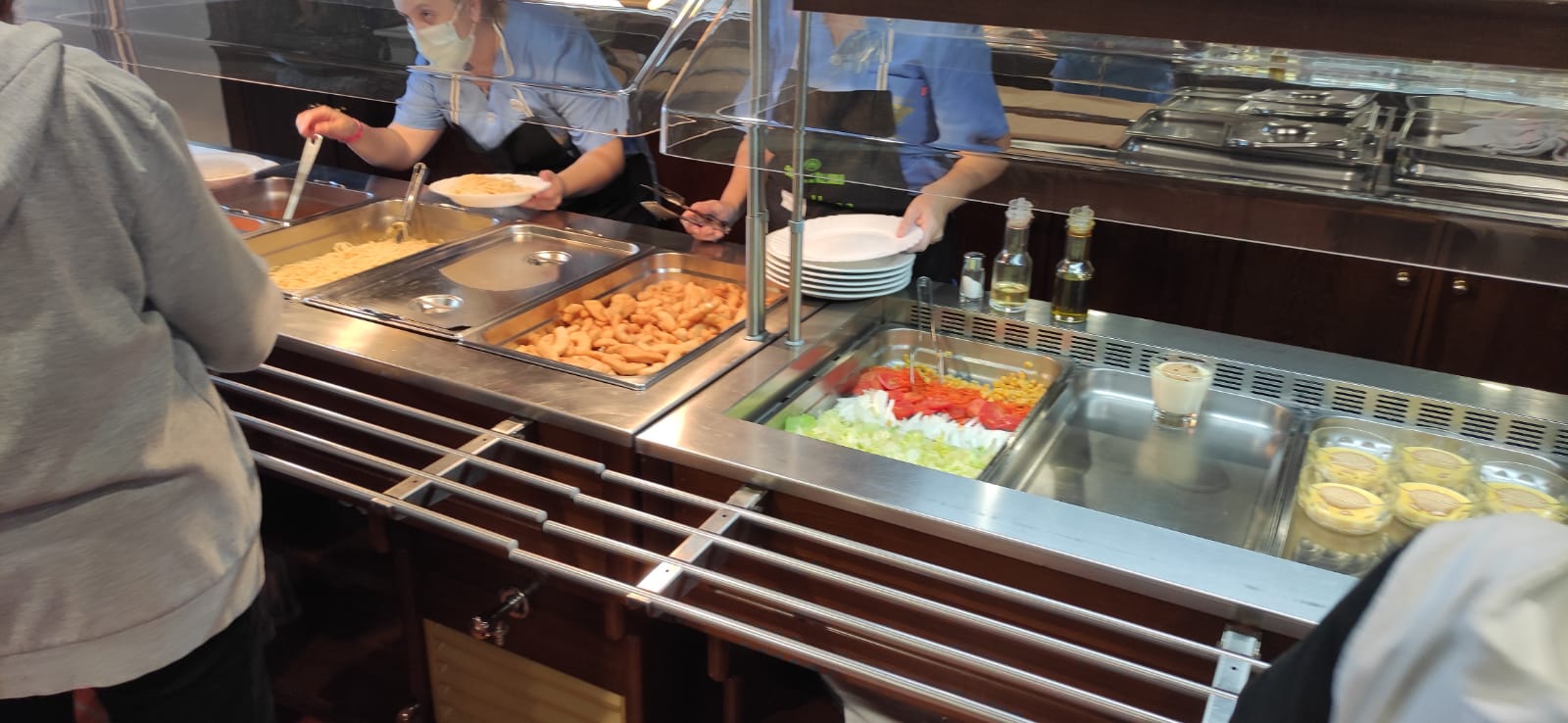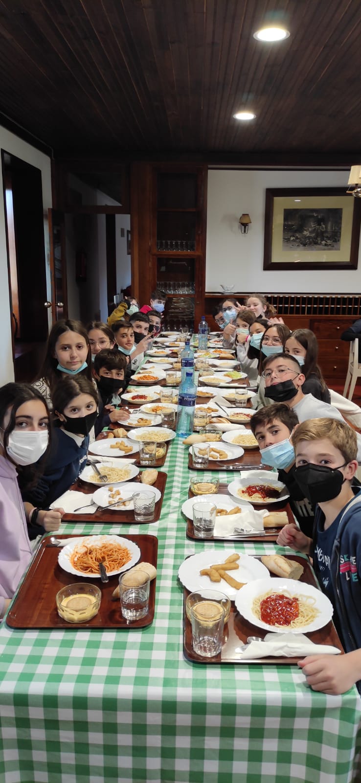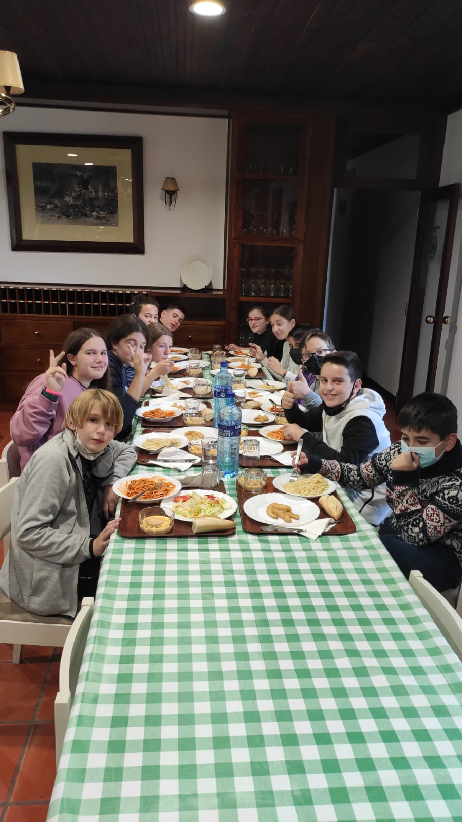Empezamos con la cena. Puré de verdura y pizza. Lo mismo volvemos con algún kilo de más… ¡Algunos han repetido puré!