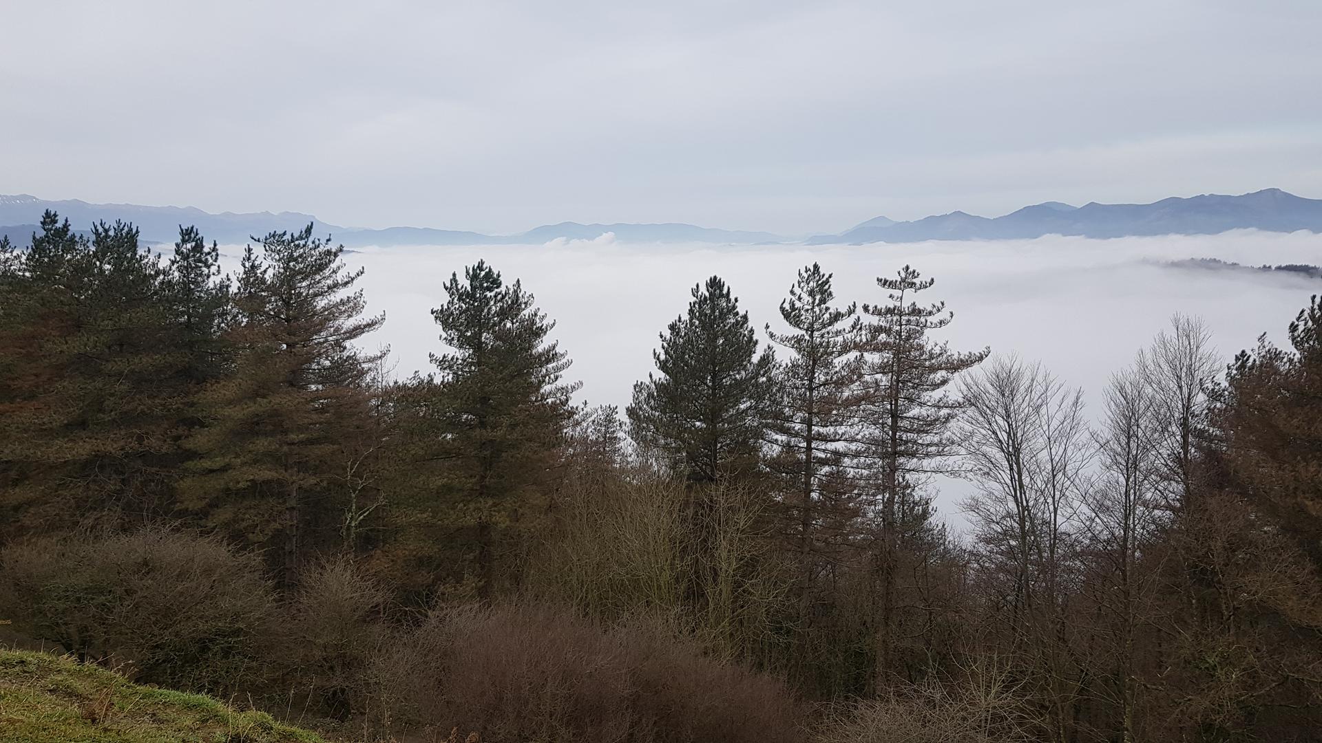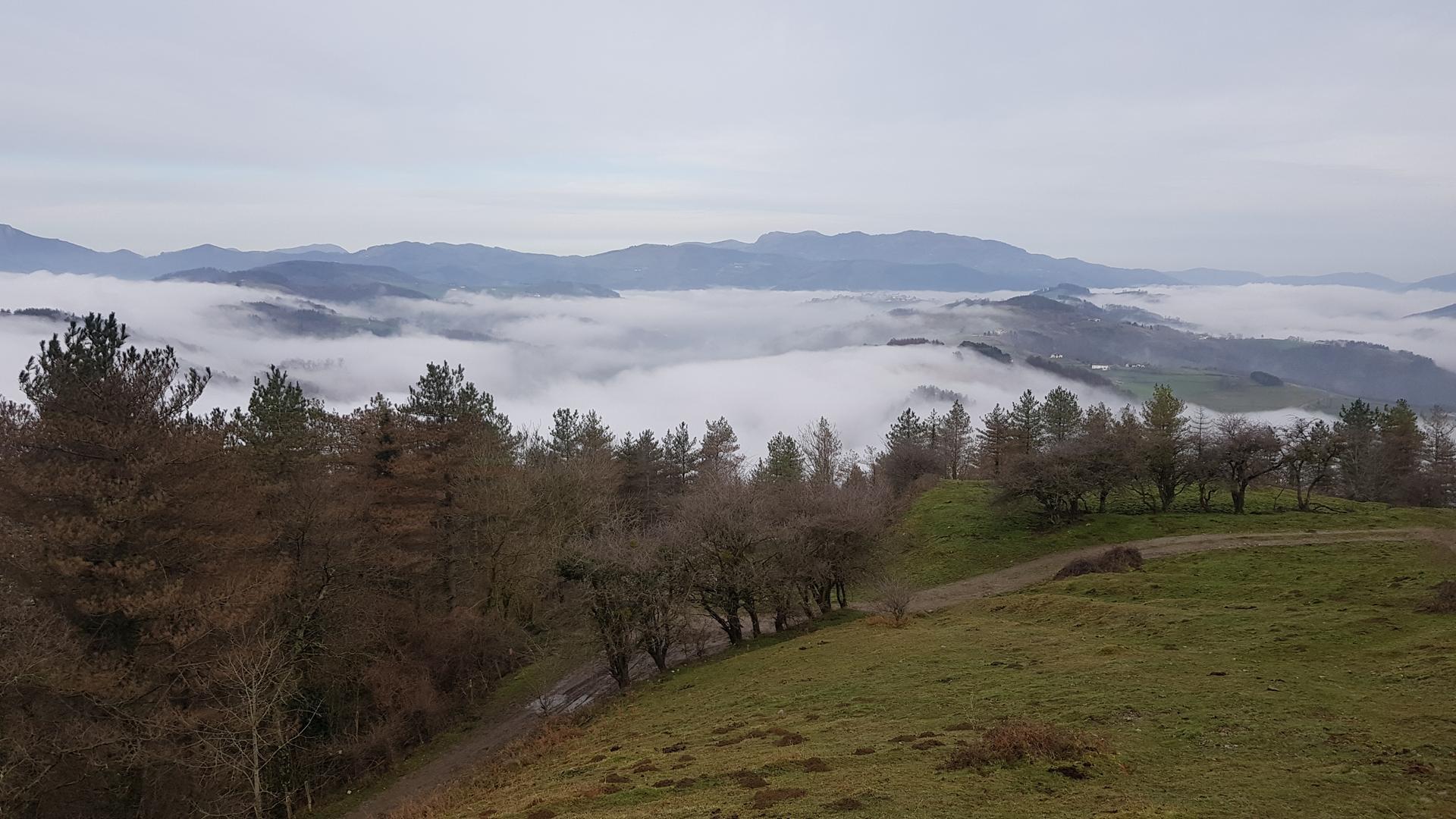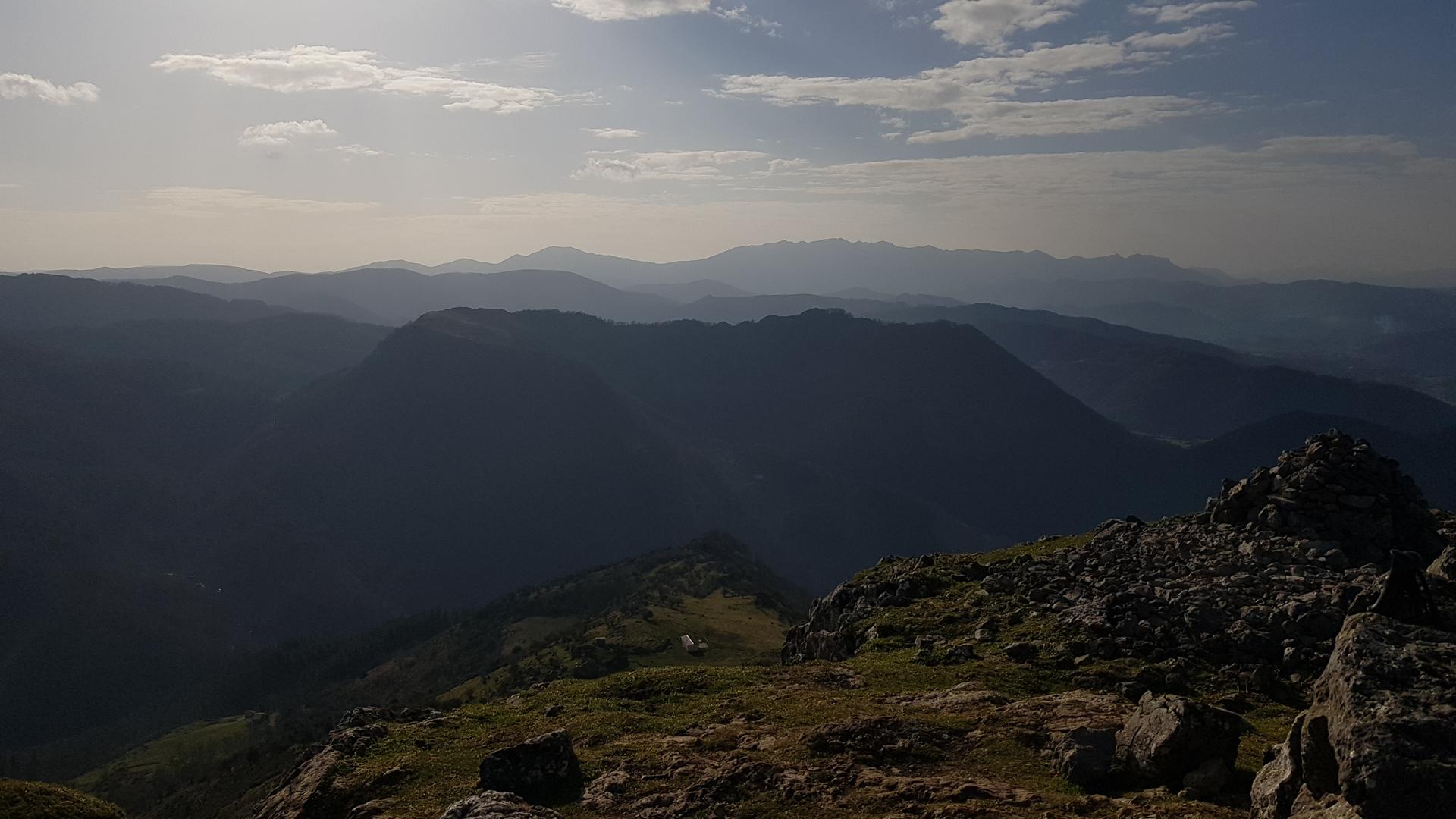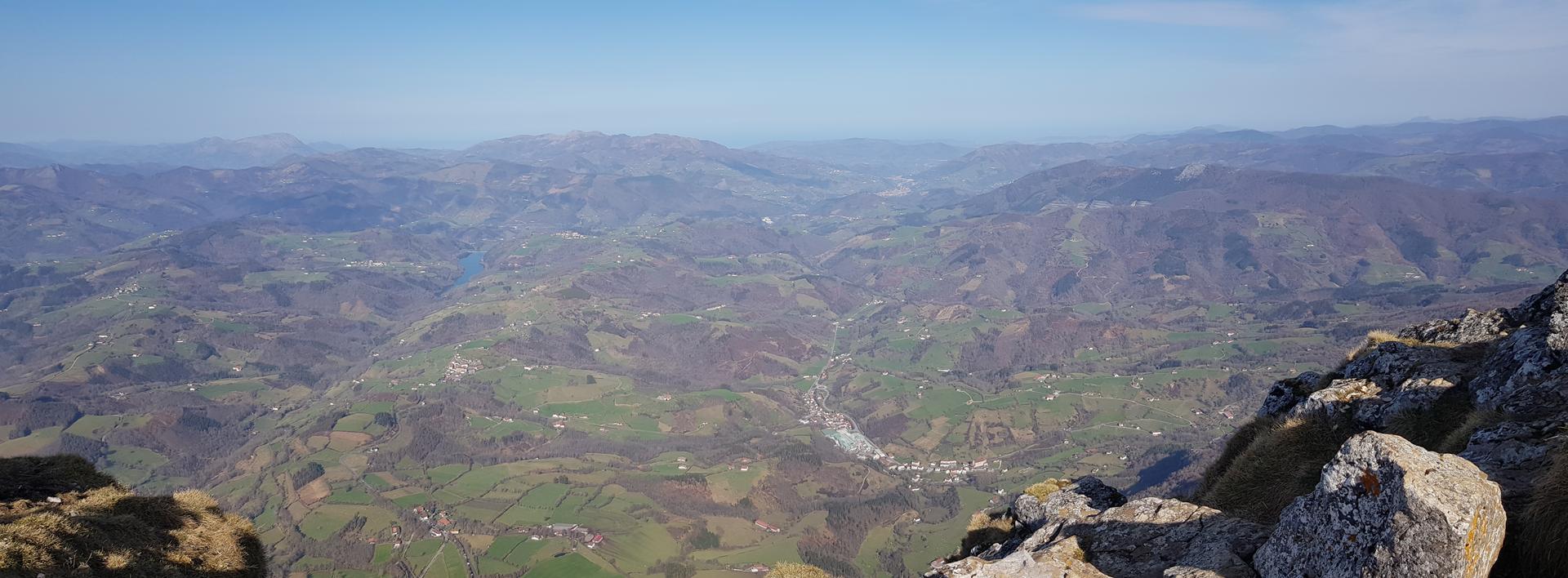 El cielo ha despejado y podemos contemplar unas vistas espectaculares: toda la zona del Goierri, el embalse de Ibiur, la bahía de San Sebastián al fondo, las sierras de Hernio, Udalatx, Anboto, Aratz, Aizkorri o Aloña entre otras, y por supuesto, las primeras cimas del enorme y espectacular paraje de Aralar, con el monte Ganboa como protagonista. ¡Sin palabras!