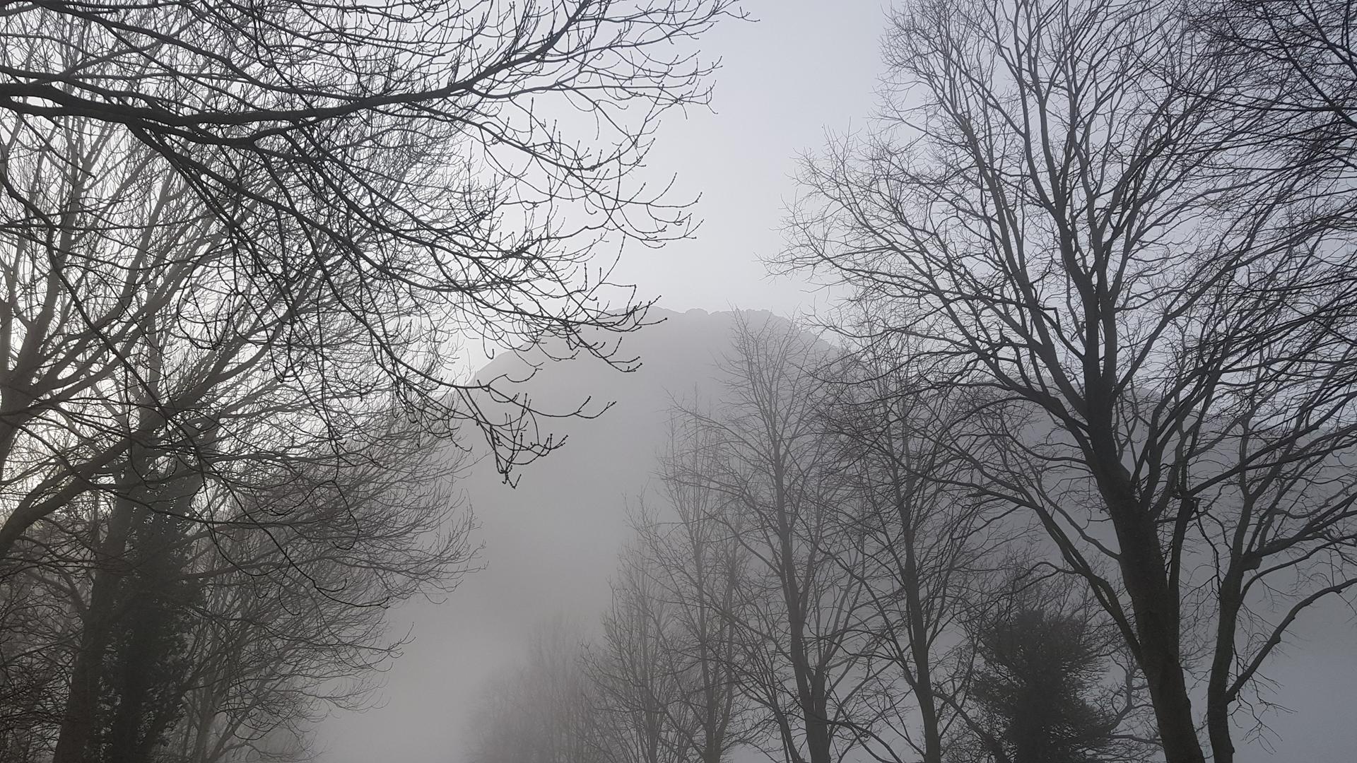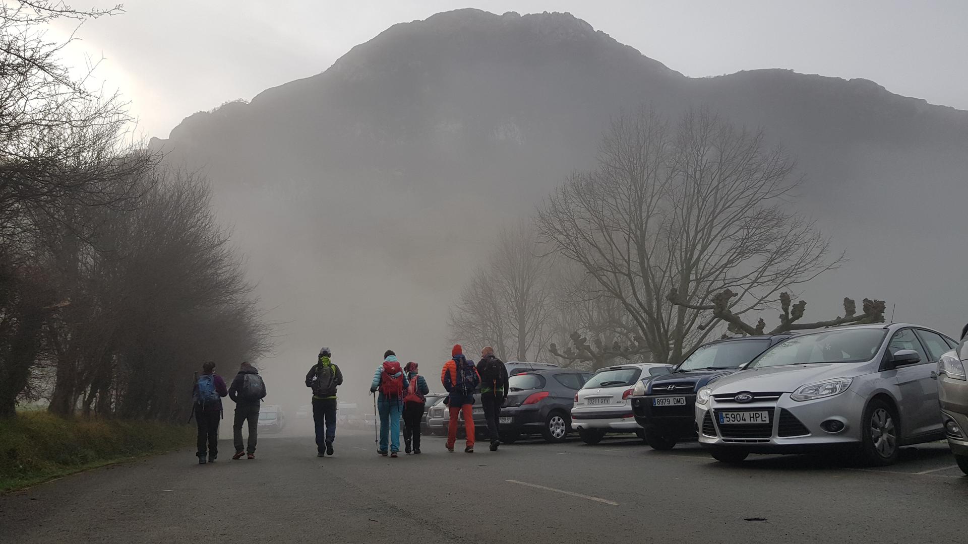 La salida la realizamos desde el abarrotado aparcamiento del barrio de Larraitz, a una altitud de aproximadamente 400 metros sobre el nivel del mar. El día está nublado y la espectacular cima del pico aparece cubierta por una densa masa de nubes.