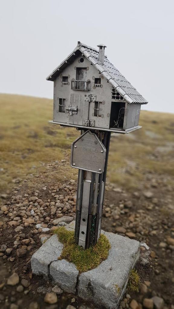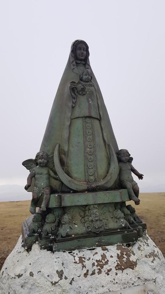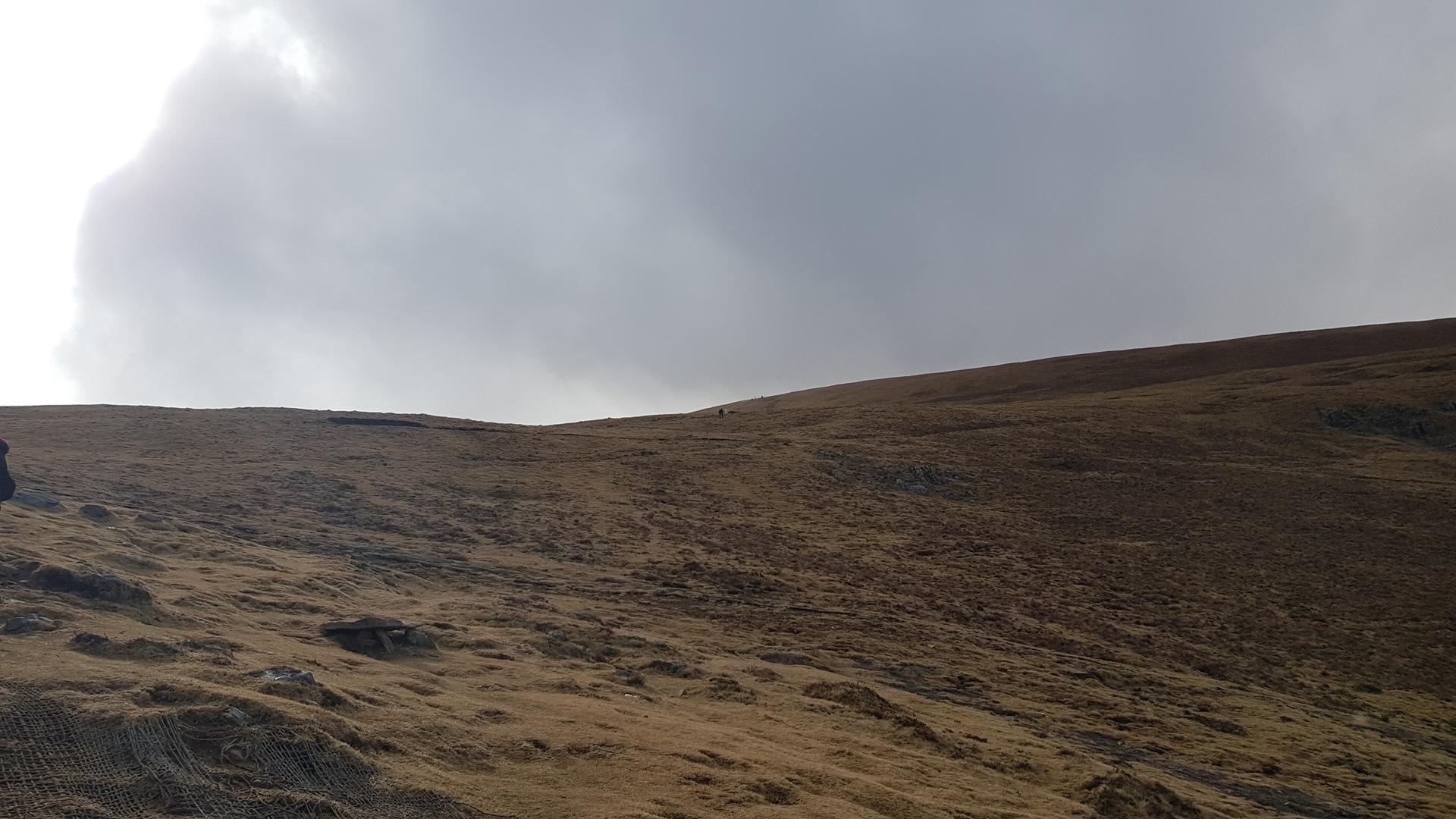 Una vez superado este tramo, giramos a nuestra derecha cambiando el terreno de rocoso a hierba. Nos queda un último gran esfuerzo con un desnivel del 45% hasta llegar a la cumbre. Durante la subida, comenzamos a divisar la espectacular cruz que corona la cumbre, aunque los fuertes vientos apenas nos dejan abrir los ojos.